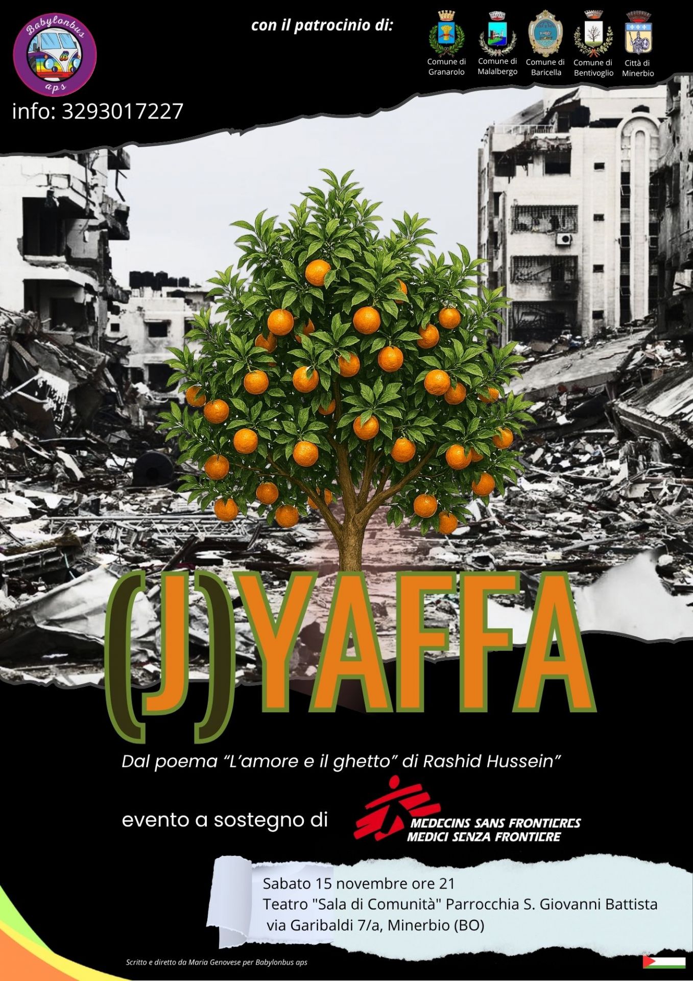 Ispirato al poema "L'amore e il ghetto" del poeta palestinese Rashid Hussein, (J)YAFFA nasce dal senso di impotenza di un gruppo di artisti e dilettanti di fronte all'inerzia e il silenzio che avvolge la storia del popolo palestinese.