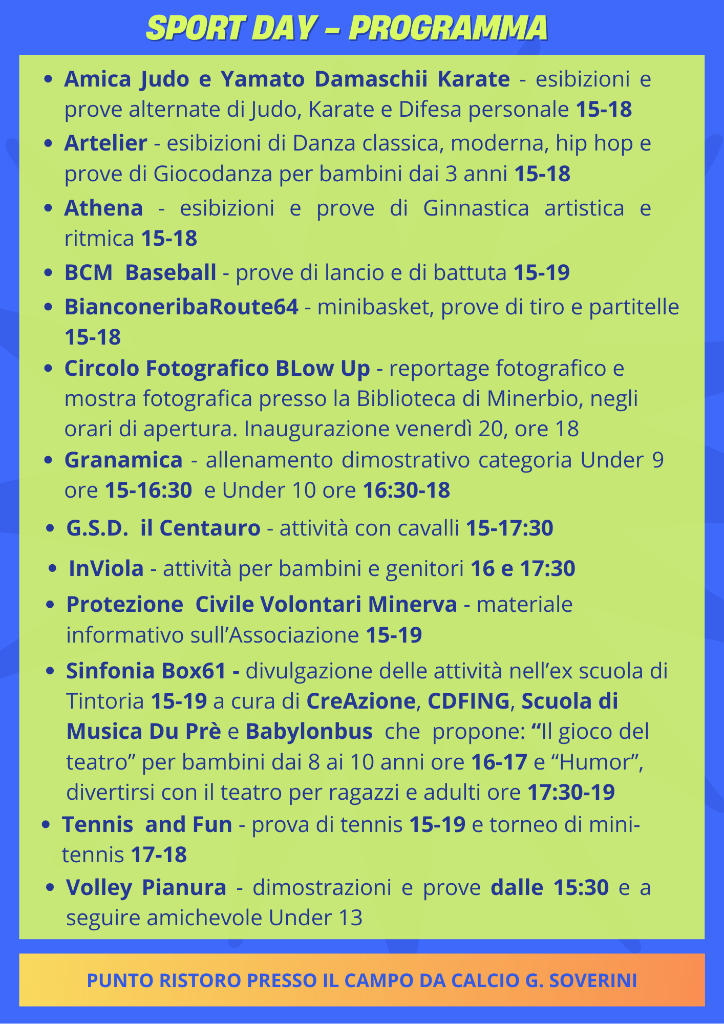 Sabato 21 settembre 2024 presso gli impianti sportivi di Minerbio (via Don Zamboni), dalle ore 15.00 si terrà l'evento Sport Day, organizzato dall'Amministrazione Comunale nell'ambito della Settimana Europea dello Sport 2024, promossa dalla Commissione Europea e coordinata dall'Ufficio per lo sport della Presidenza del Consiglio dei Ministri.