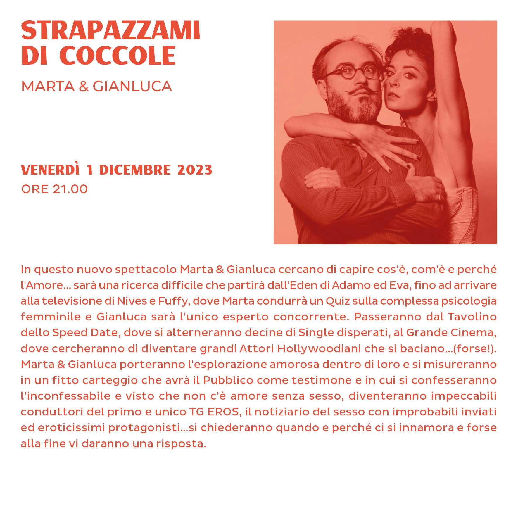 Il secondo appuntamento della rassegna di Teatro comico e commedia della stagione teatrale 2022/2023 di Palazzo Minerva "Strapazzami di coccole" con Marta & Gianluca è confermato per Venerdì 1 dicembre 2023 alle ore 21.00.
