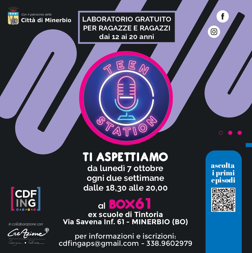 Laboratorio gratuito di web radio per ragazze e ragazzi dai 12 ai 20 anni. Appuntamento il lunedì, ogni due settimane, dalle ore 18,30 alle 20,00 al BOX61(ex scuole di Tintoria, Via Savena Inferiore, 61)