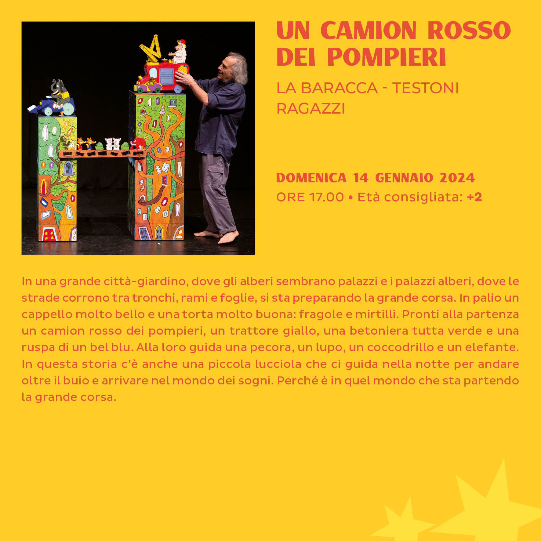 In scena Un camion rosso dei pompieri, di e con La Baracca - Testoni ragazzi. Consigliato dai 2 anni.