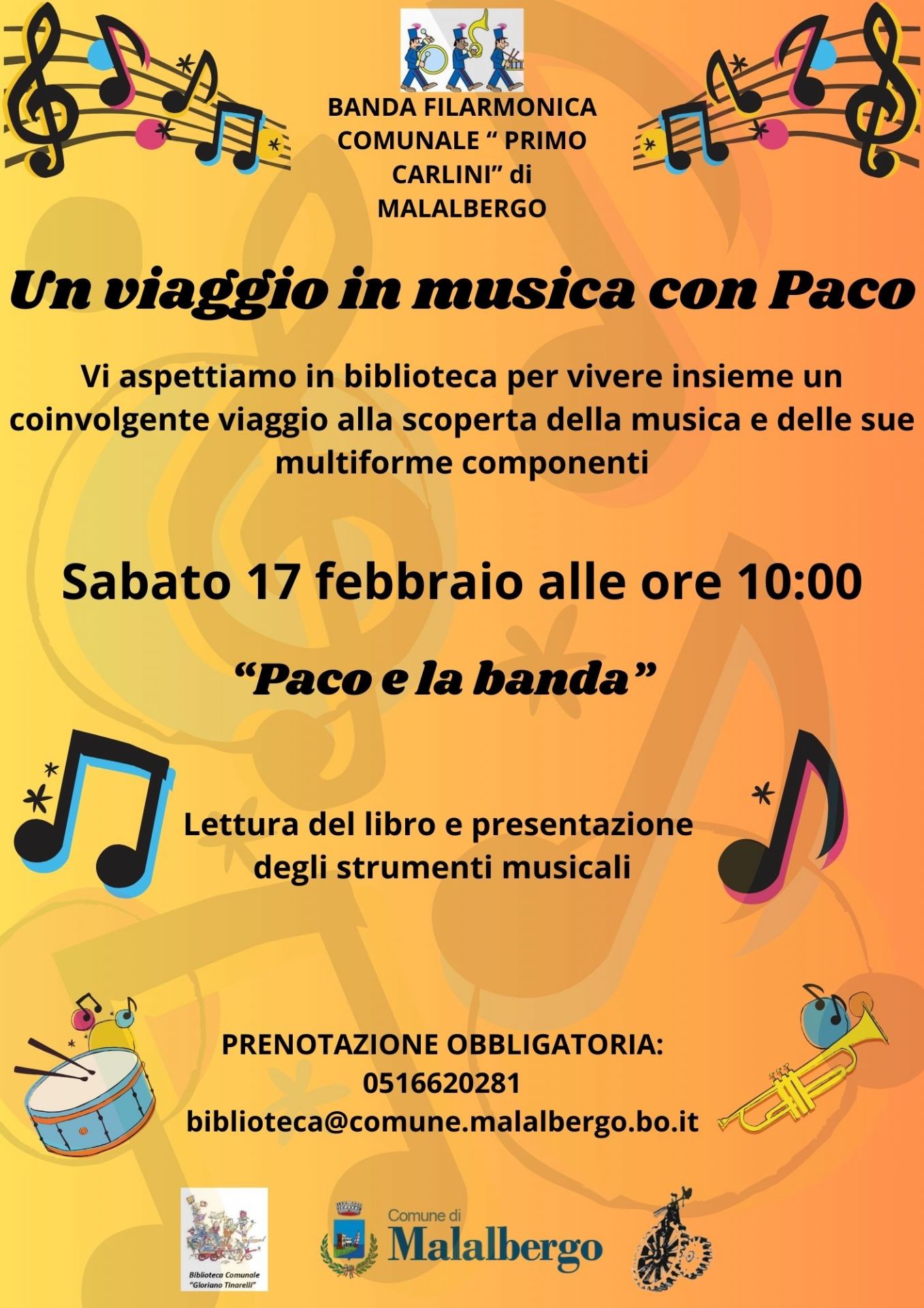 Sabato 17 Febbraio ore 10:00 nella Biblioteca Comunale Gloriano Tinarelli si svolgerà "un viaggio in musica con Paco", un viaggio coinvolgente alla scoperta della musica e delle sue multiforme componenti come da volantino in allegato.