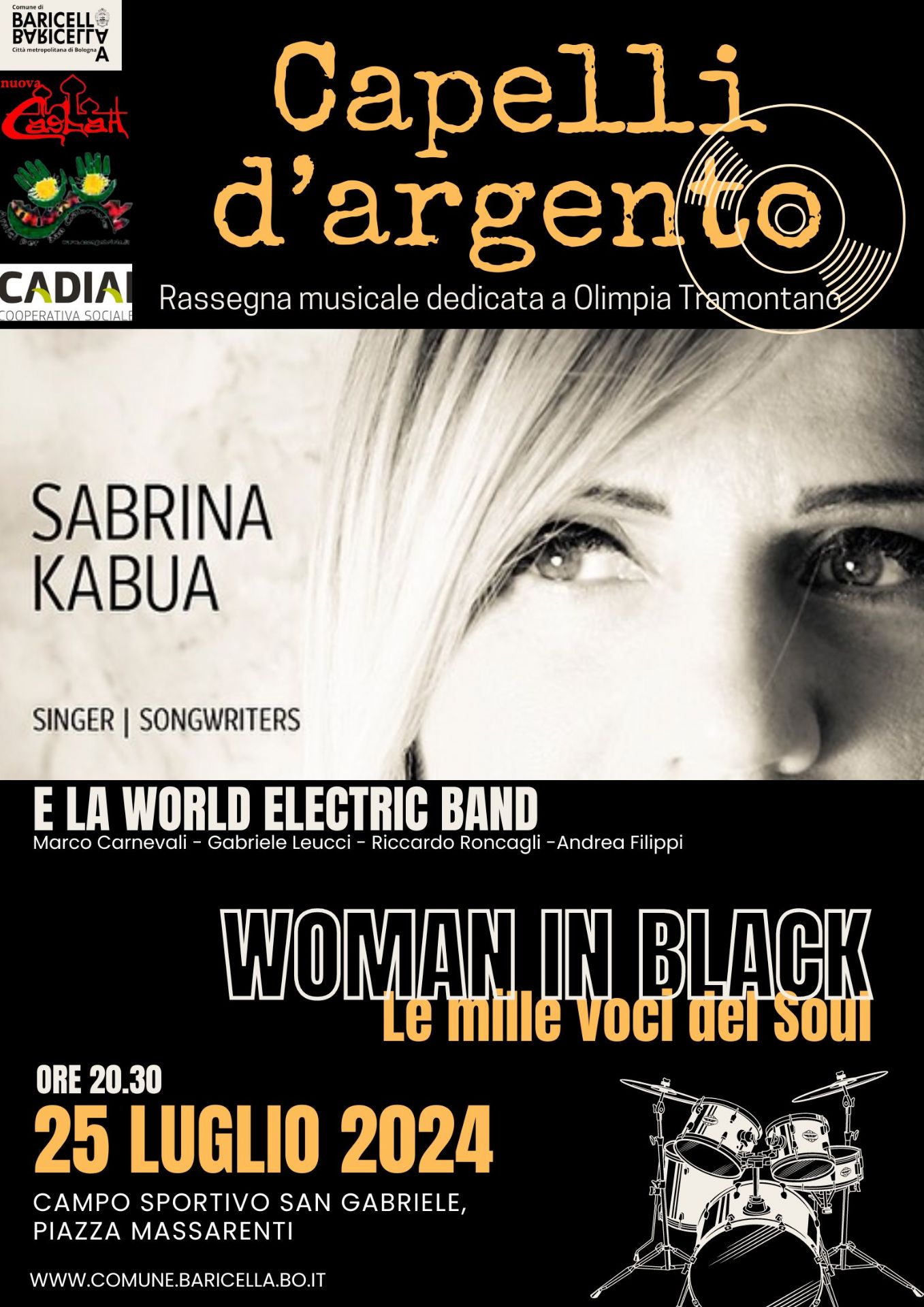 Per l'ultimo appuntamento della 26° edizione della rassegna musicale Capelli d'Argento, vi aspettiamo al campo sportivo di San Gabriele di Baricella per il concerto di SABRINA KABUA e la WORLD ELECTRIC BAND! Frutto di un nuovo progetto musicale Soul Funk Pop, con la supervisione dell'etichetta Discografica Screaming Cockatiel Records, Sabrina Kabua e la sua band ripercorreranno le mille voci del soul, arrangiando quei brani che hanno fatto la storia della "musica dell'anima", che nacque negli anni sessanta negli Stati Uniti come derivazione del R&B, dalla fusione delle sonorità del jazz e del gospel con i modi della canzone pop. Oggi è un genere che si rinnova con influenze Hip Hop, DnB, Acid jazz.