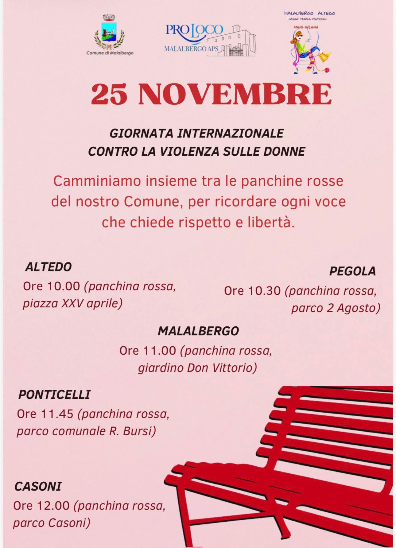 25 NOVEMBRE – Giornata internazionale contro la violenza sulle donne. Camminiamo insieme tra le panchine rosse del nostro Comune per ricordare ogni voce che chiede rispetto, ascolto e libertà.