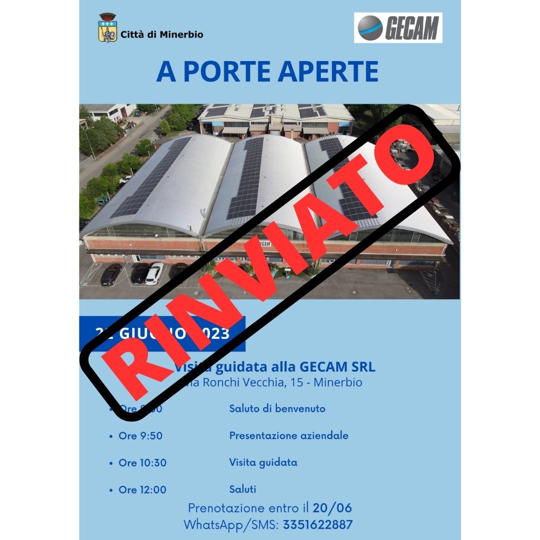 Si comunica che l'incontro "A porte aperte" presso la GECAM SRL, inizialmente previsto per giovedì 22 giugno, è stato rinviato a data da destinarsi.