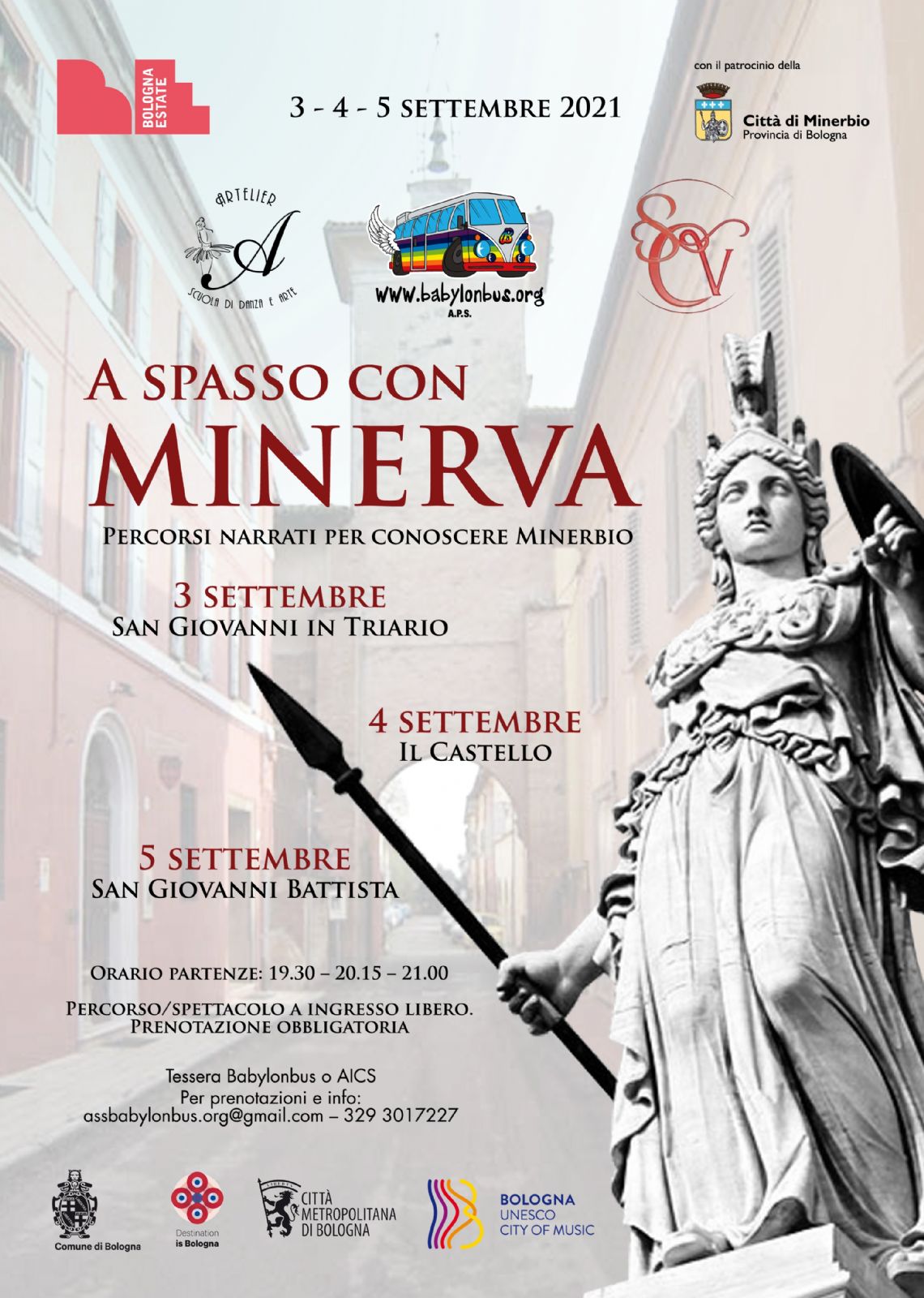All'interno della rassegna di Bologna Estate, Il 3, il 4 e il 5 settembre si terrà l'evento "A spasso con Minerva": percorsi/spettacoli con narrazioni e musica per conoscere Minerbio.