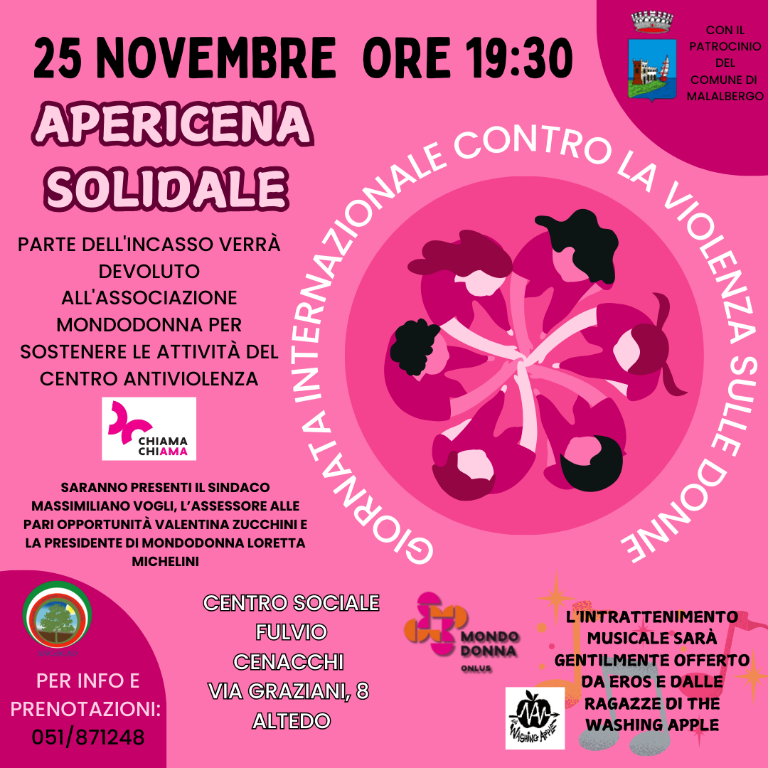 Apericena Solidale presso il Centro Sociale Fulvio Cenacchi di Altedo. Parte del ricavato verrà devoluto all'associazione Mondodonna per sostenere le attività del centro antiviolenza.