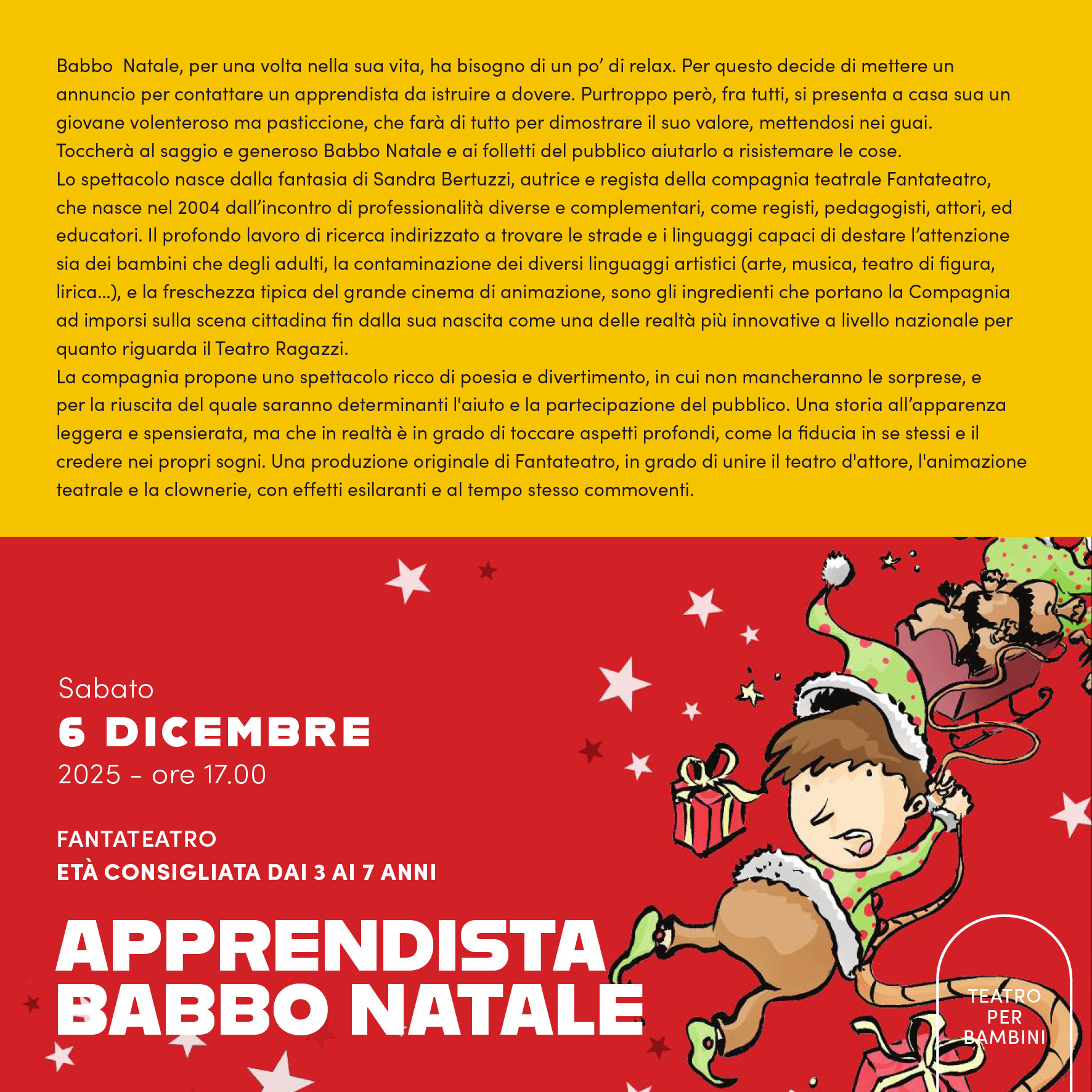 Sabato 6 dicembre 2025 alle ore 17.00 si terrà a Palazzo Minerva lo spettacolo "Apprendista Babbo Natale", dell'Associazione FantaTeatro.