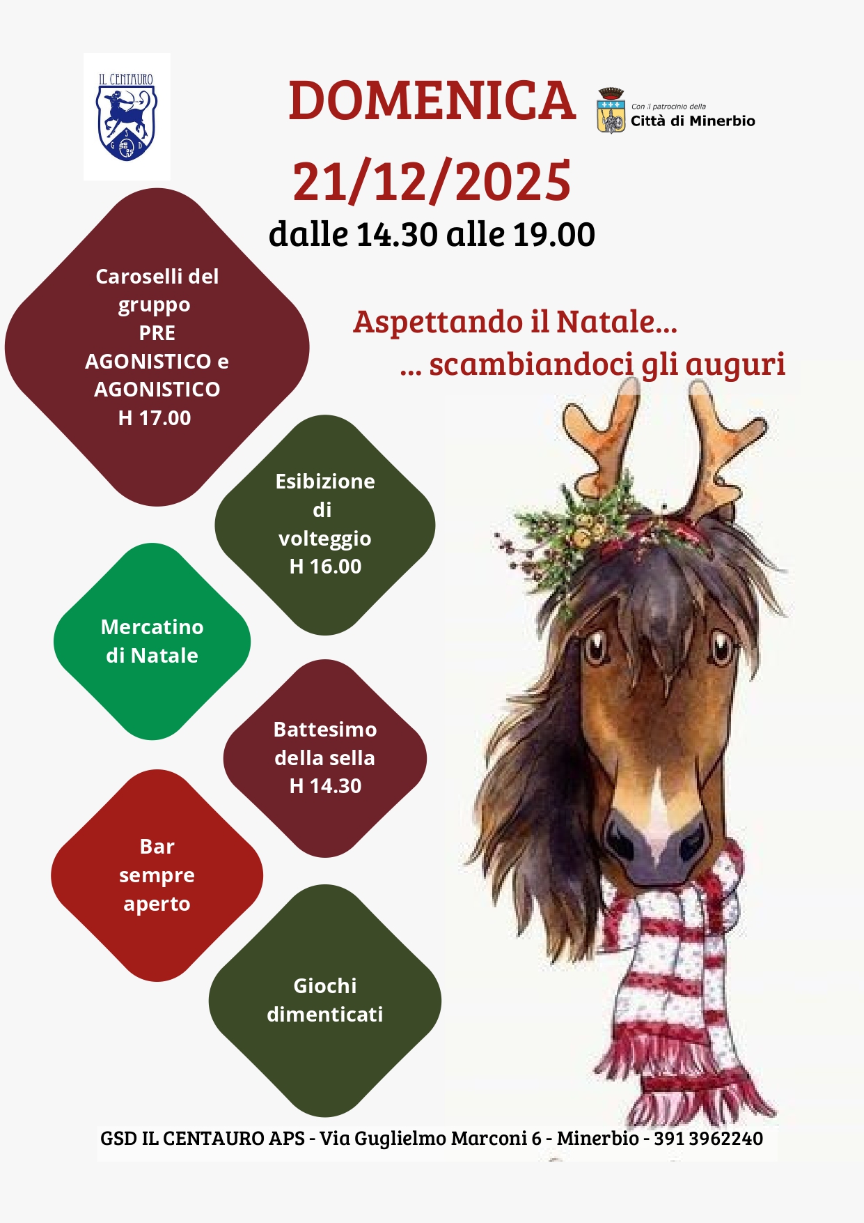 Domenica 21 dicembre 2025 l'Aps GSD Il Centauro vi aspetta presso la propria sede in via G. Marconi 6 a Minerbio per festeggiare il Natale e scambiare gli auguri con tante interessanti attività.
