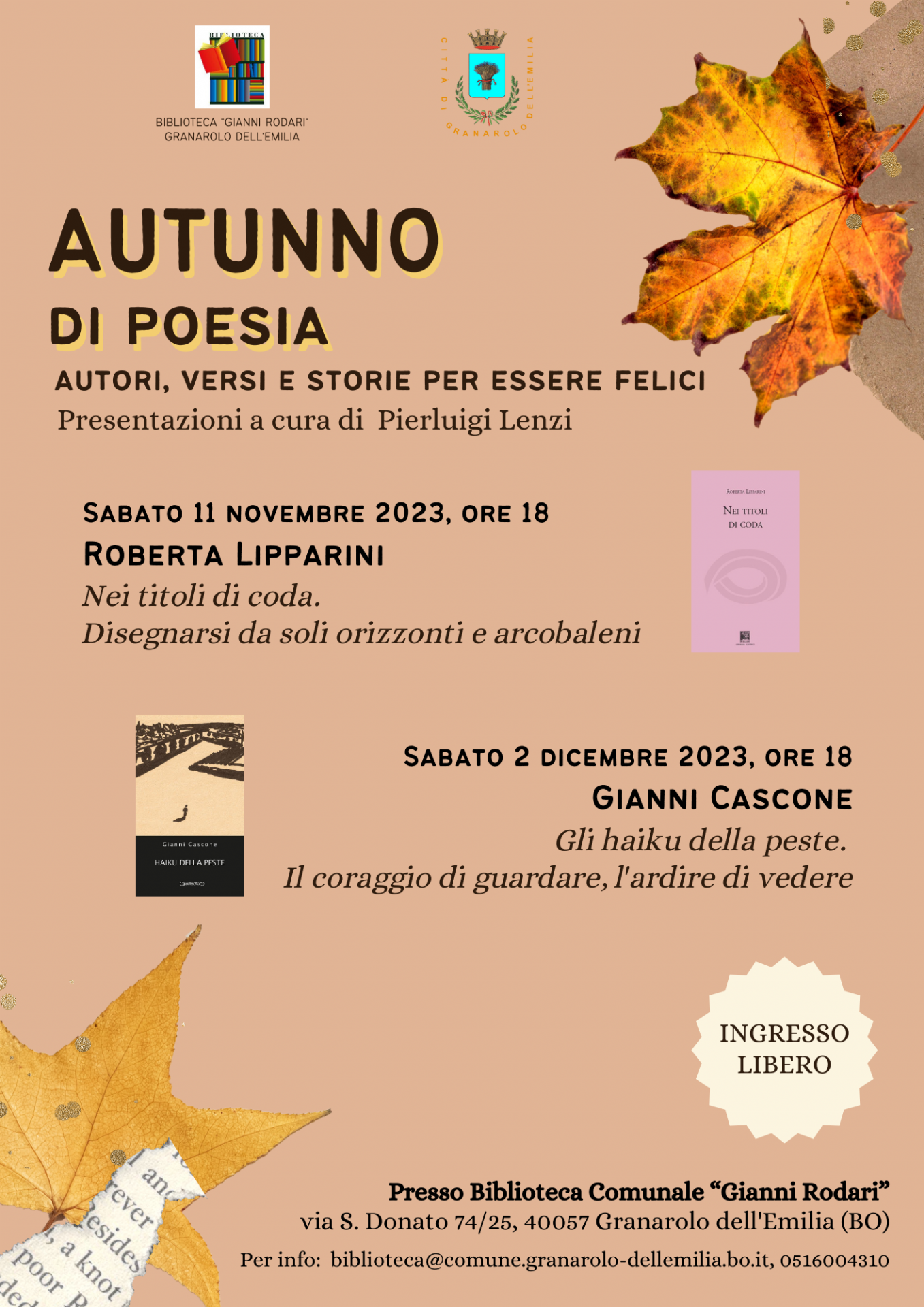 Sabato 11 novembre e sabato 2 dicembre, alle ore 18 in Biblioteca Comunale “Gianni Rodari” (via S. Donato 74/25), Pierluigi Lenzi presenta "Autunno di poesia", autori, versi e storie per essere felici.