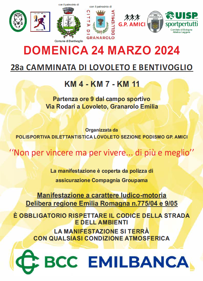 Domenica 24 marzo si tiene la 28esima edizione della "Camminata di Lovoleto e Bentivoglio", organizzata dalla Polisportiva Dilettantistica Lovoleto - Sezione Podismo GP. Amici.