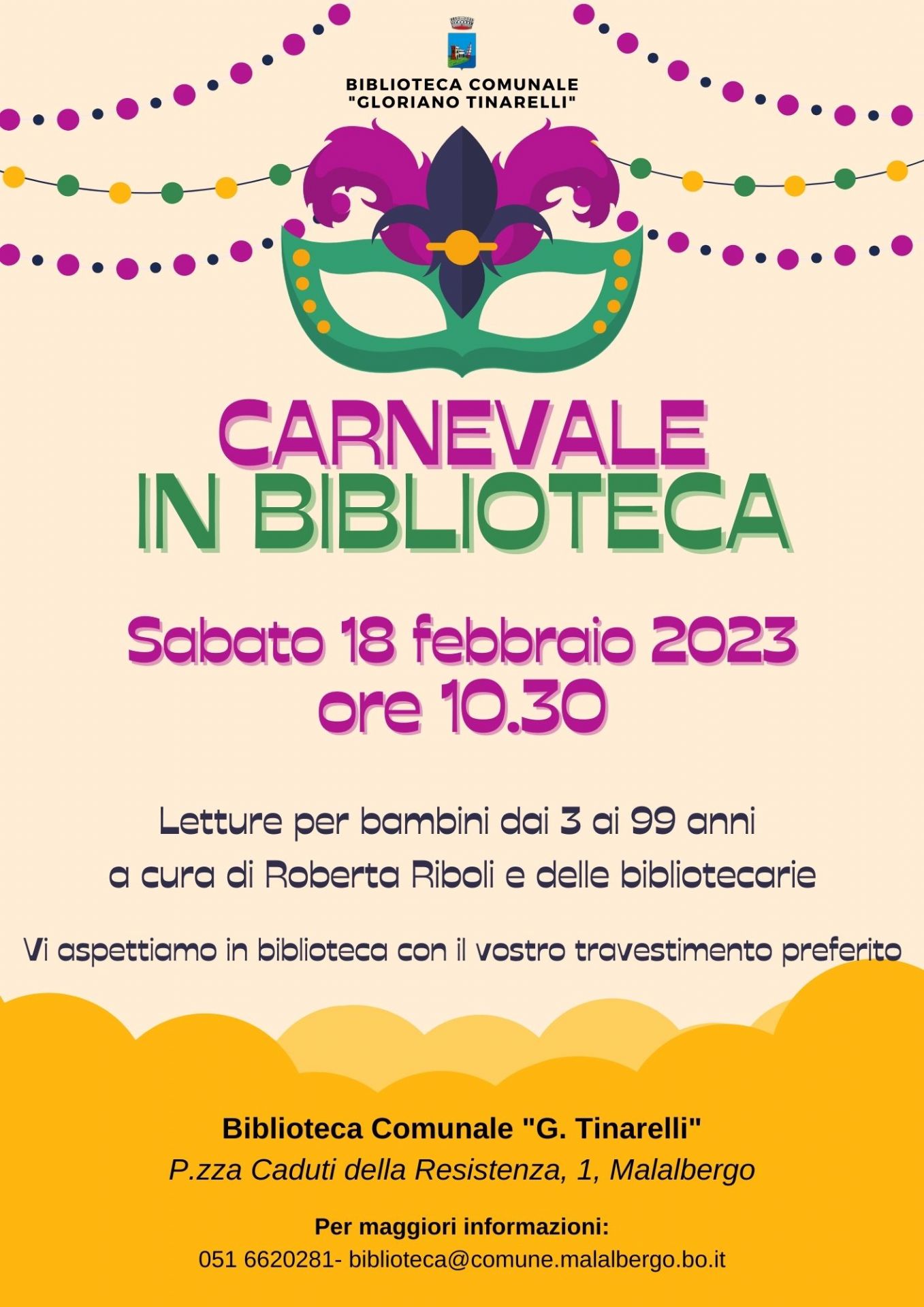 Sabato 18 Febbraio ore 10:30 si svolgerà presso la Biblioteca Comunale "Gloriano Tinarelli" il Carnevale in Biblioteca, con letture per bambini.
