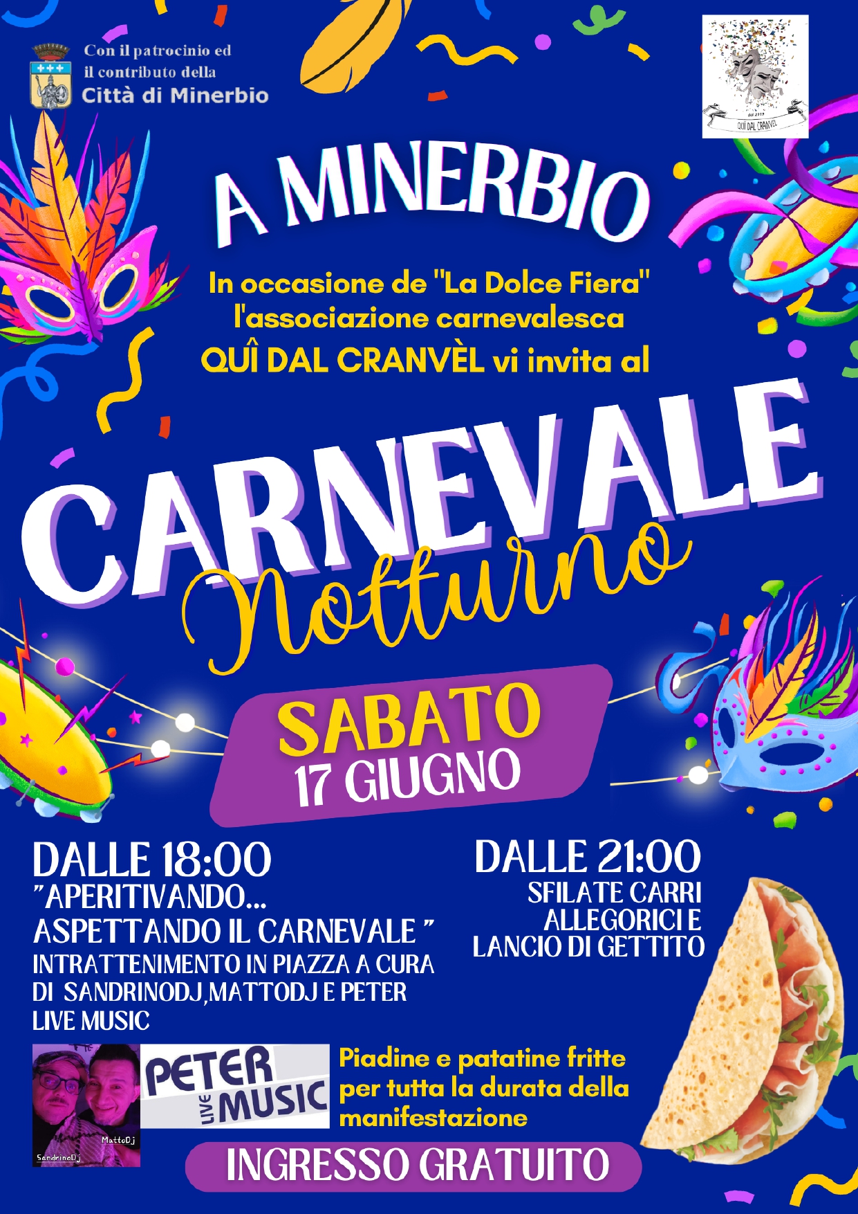 In occasione della 23° edizione di LA DOLCE FIERA, come da tradizione, sabato 17 giugno 2023 si terrà a Minerbio il CARNEVALE NOTTURNO a cura dell'associazione carnevalesca Quì dal Cranvèl.