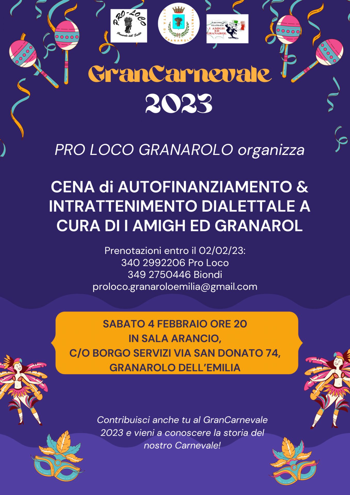 Per rendere la festa ancora più grande e divertente c'è bisogno del contributo di tutti. Per questo la Pro-Loco Granarolo Dell'Emilia, una delle realtà del territorio che dà vita al GranCarnevale 2023, organizza il primo degli eventi di autofinanziamento. Si comincia sabato 4 febbraio con una cena con intrattenimento dialettale a cura di I Amigh ed Granarol.