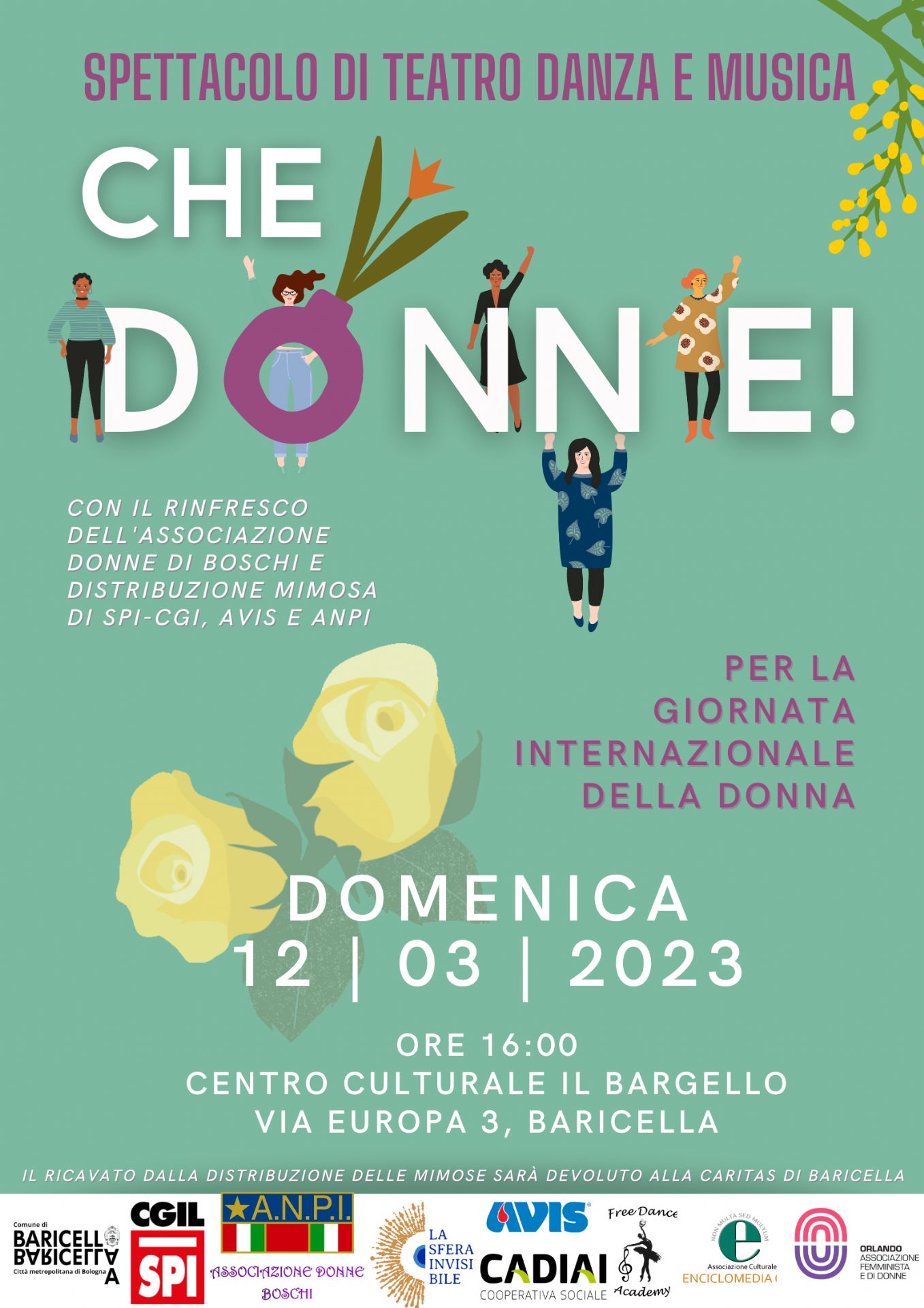 Nell'ambito delle iniziative del Comune di Baricella per la Giornata Internazionale della donna, Domenica 12 Marzo alle ore 16:00 presso il Centro Culturale il Bargello, ci sarà uno spettacolo di teatro, danza e musica intitolato "CHE DONNE!", a cura di Enciclomedia Odv, Spi-Cgil, ANPI, La Sfera invisibile, Free Dance Academy, Associazione Orlando, Avis e CADIAI.