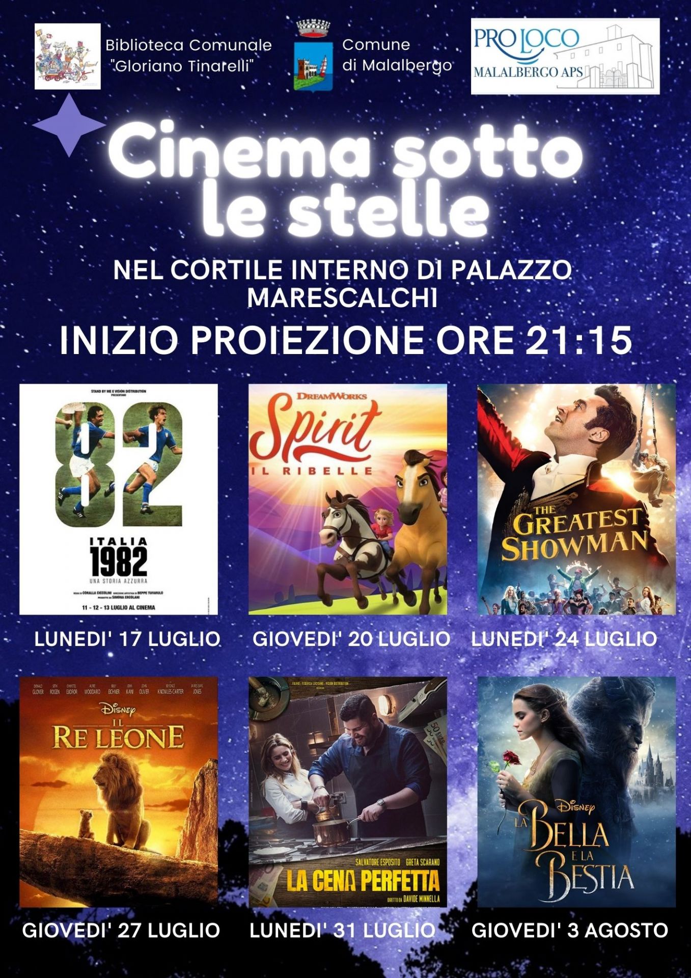 A partire da Lunedì 17/07, ogni lunedì e giovedì sera, presso il cortile interno del Palazzo Marescalchi, alle ore 21:15 le proiezioni di "Cinema sotto le stelle" con programmazione come da volantino in allegato.