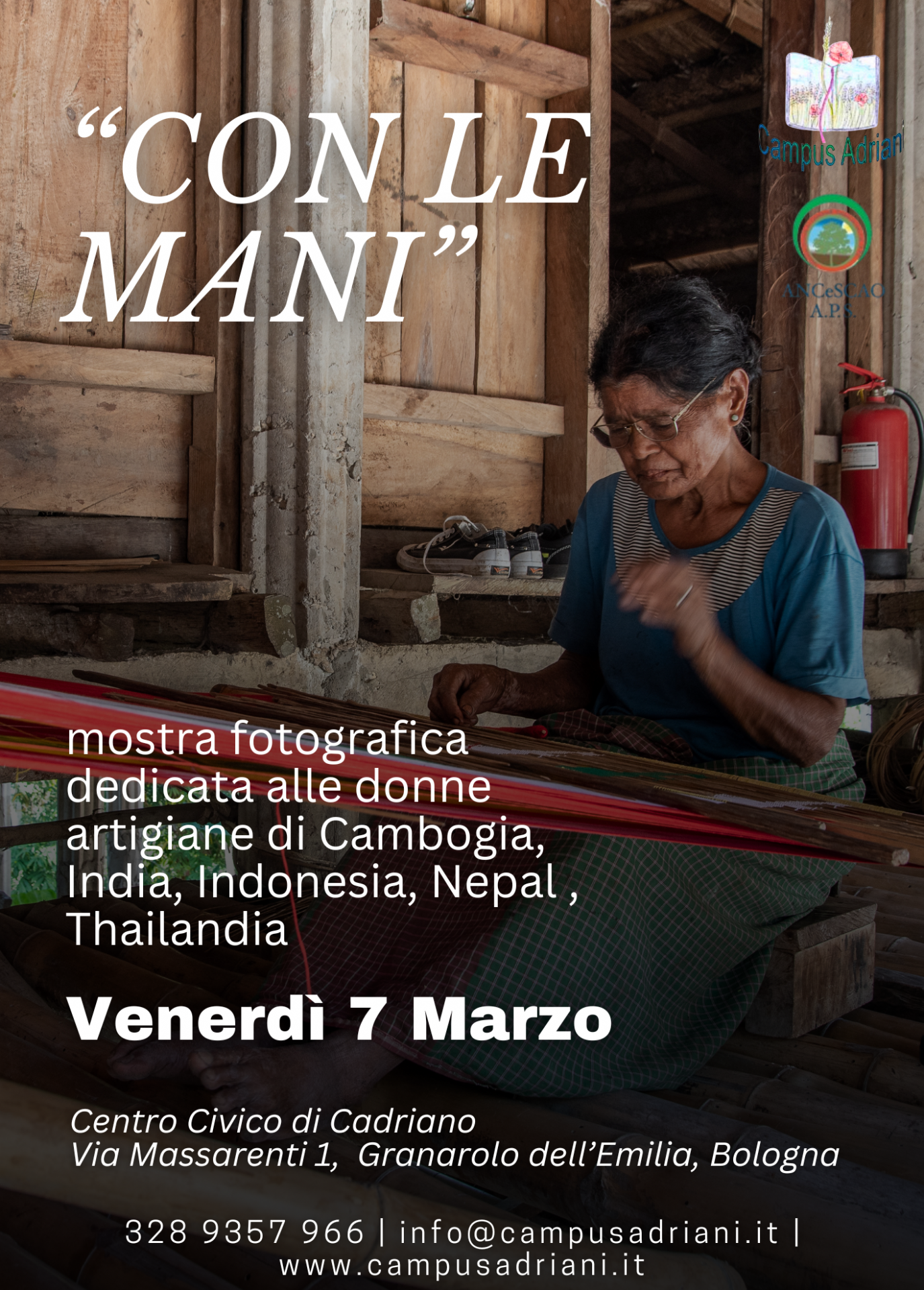 Venerdì 7 e sabato 8 marzo, in occasione della Giornata Internazionale della Donna, presso il Centro Civico di Cadriano (Via Massarenti 1, Granarolo dell’Emilia, Bologna) inaugura la mostra fotografica "Con le mani", dedicata alle donne artigiane di Cambogia, India, Indonesia, Nepal e Thailandia.