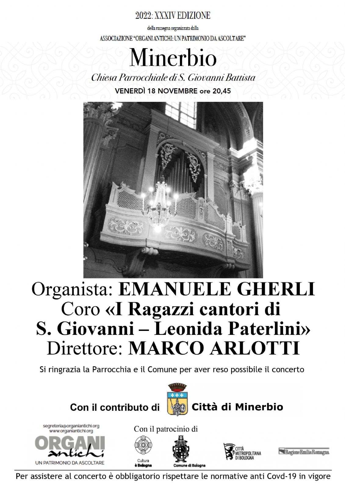 All'interno della XXXIV edizione della rassegna organizzata dall'associazione "Organi Antichi: un patrimonio da ascoltare", si terrà venerdì 18 novembre 2022 alle ore 20.45 presso la Chiesa parrocchiale di San Giovanni Battista di Minerbio il concerto.
