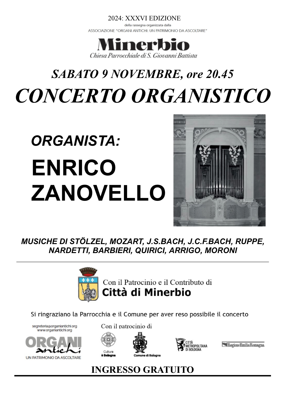 Sabato 9 novembre 2024 alle ore 20.45 presso la Chiesa parrocchiale di San Giovanni Battista di Minerbio si terrà il concerto per organo della 36° edizione della rassegna organizzata dall'associazione "Organi antichi: un patrimonio da ascoltare".