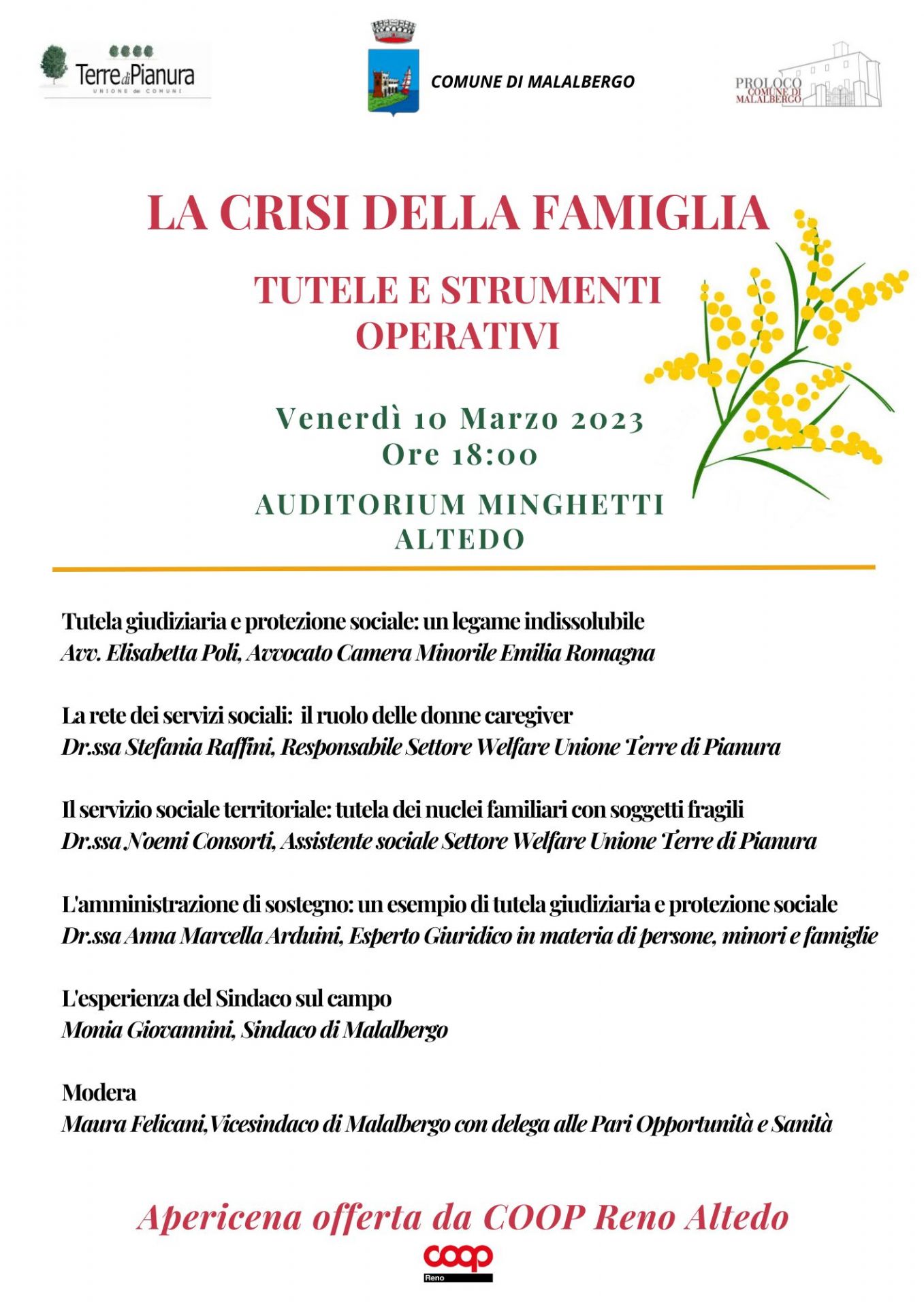 Il Comune di Malalbergo promuove il convegno "La crisi della famiglia, tutele e strumenti operativi", che si terrà presso l'Auditorium Minghetti di Altedo Venerdì 10 Marzo alle ore 18:00, con il duplice obiettivo di stimolare una riflessione sulla famiglia ed al tempo stesso far conoscere le tutele e la rete di aiuto.