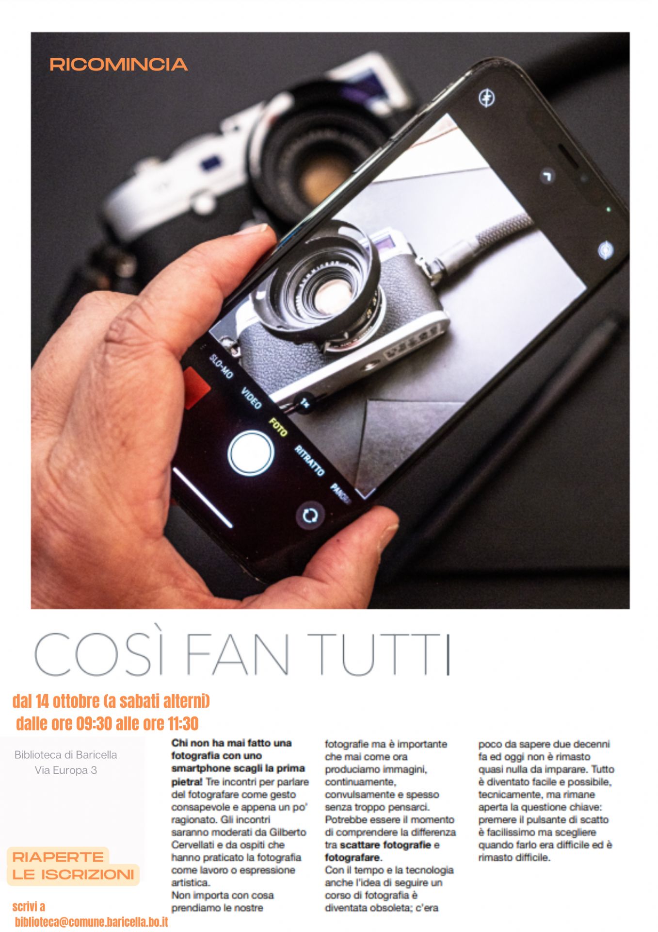Ricomincia il corso di fotografia, a cura di Gilberto Cervellati (giornalista, direttore de "il Municipio di Baricella" e fotografo esperto), e parte dall’assunto che, grazie all’avvento degli smartphone, ognuno di noi ha uno strumento fotografico nelle proprie tasche.