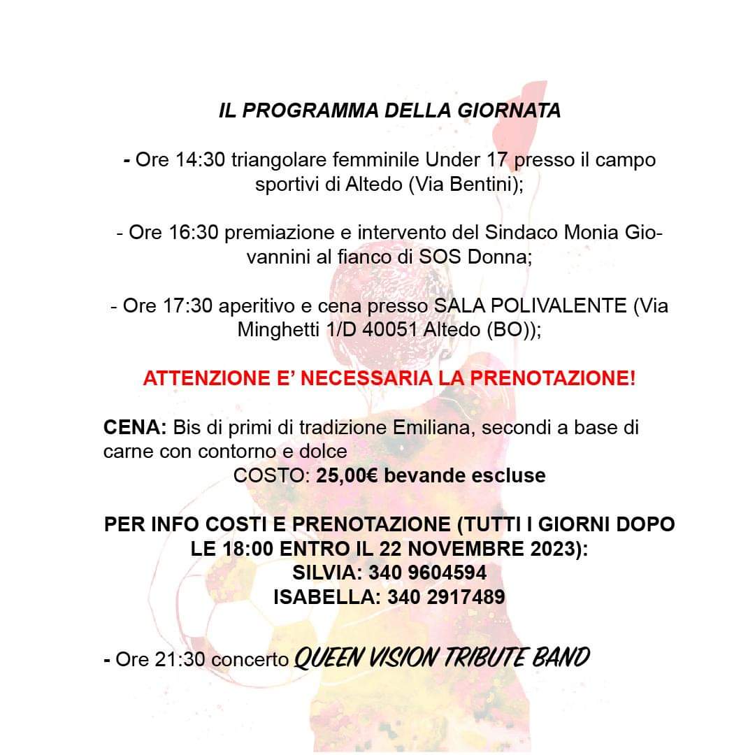 Per la Giornata Internazionale Contro la Violenza sulle Donne sabato 25 Novembre si terrà l'iniziativa Diamo un Rosso alla Violenza a cura della società Balça Poggese e patrocinata dal comune di Baricella.