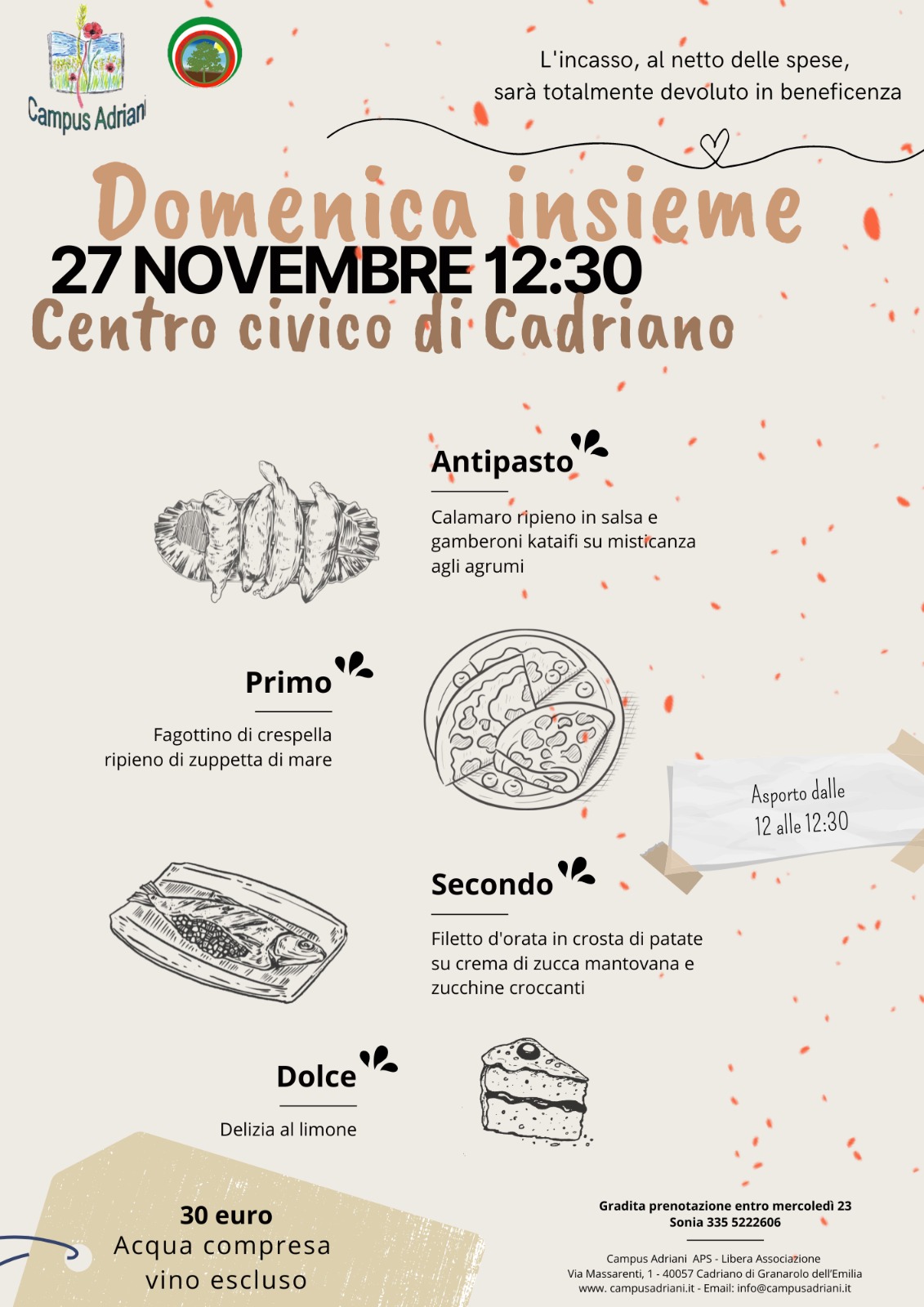 Campus Adriani organizza, domenica 27 novembre, un pranzo a base di pesce di mare presso il centro civico "Il parco" di Cadriano (via Massarenti 1). Antipasto, primo, secondo, dolce, acqua compresa e vino escluso a 30 euro. Dalle 12 alle 12.30 sarà possibile richiedere anche l'asporto.