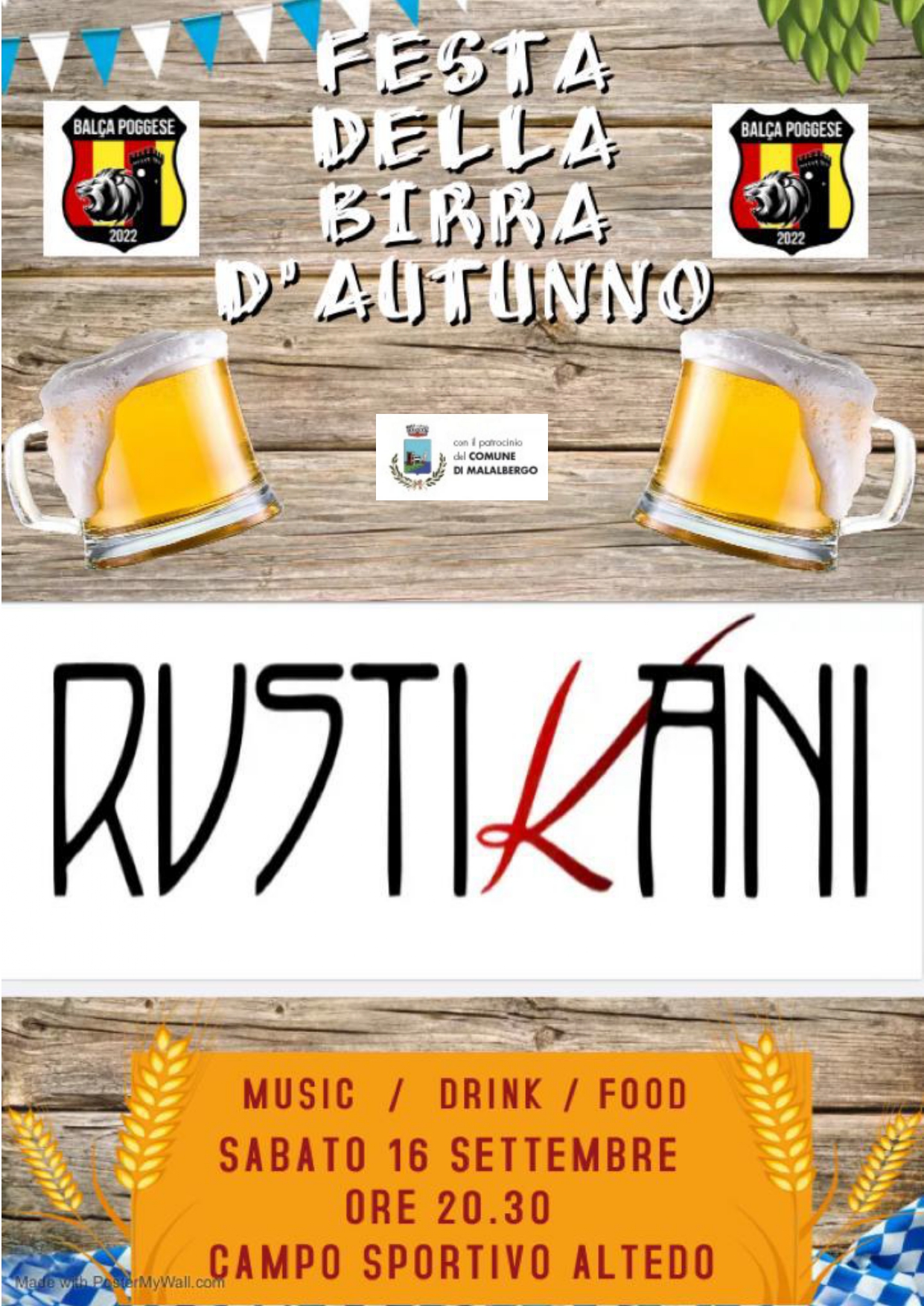 Festa della Birra d'Autunno 16 e 17 Settembre / 23 e 24 Settembre / 30 Settembre e 1 Ottobre.