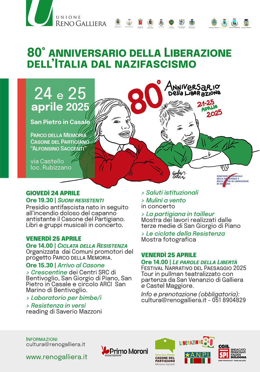 L'Unione Reno Galliera, i suoi otto comuni e i comuni che promuovono il progetto Parco della Memoria, ossia Baricella, Granarolo, Minerbio e Malalbergo, con a partecipazione di ANPI, e SPI CGIL, organizzano una serie di eventi che ruotano intorno a un luogo simbolo della nostra Liberazione, e cioè il Casone del Partigiano.