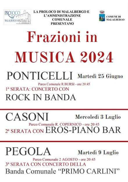 Le serate, organizzate da ProLoco in collaborazione con il Comune di Malalbergo, sono inserite nella cornice delle frazioni del territorio comunale, Ponticelli, Casoni e Pegola, perché anche queste piccole realtà possano vantare un evento espressamente a loro dedicato, una ricchezza destinata a crescere nel tempo.