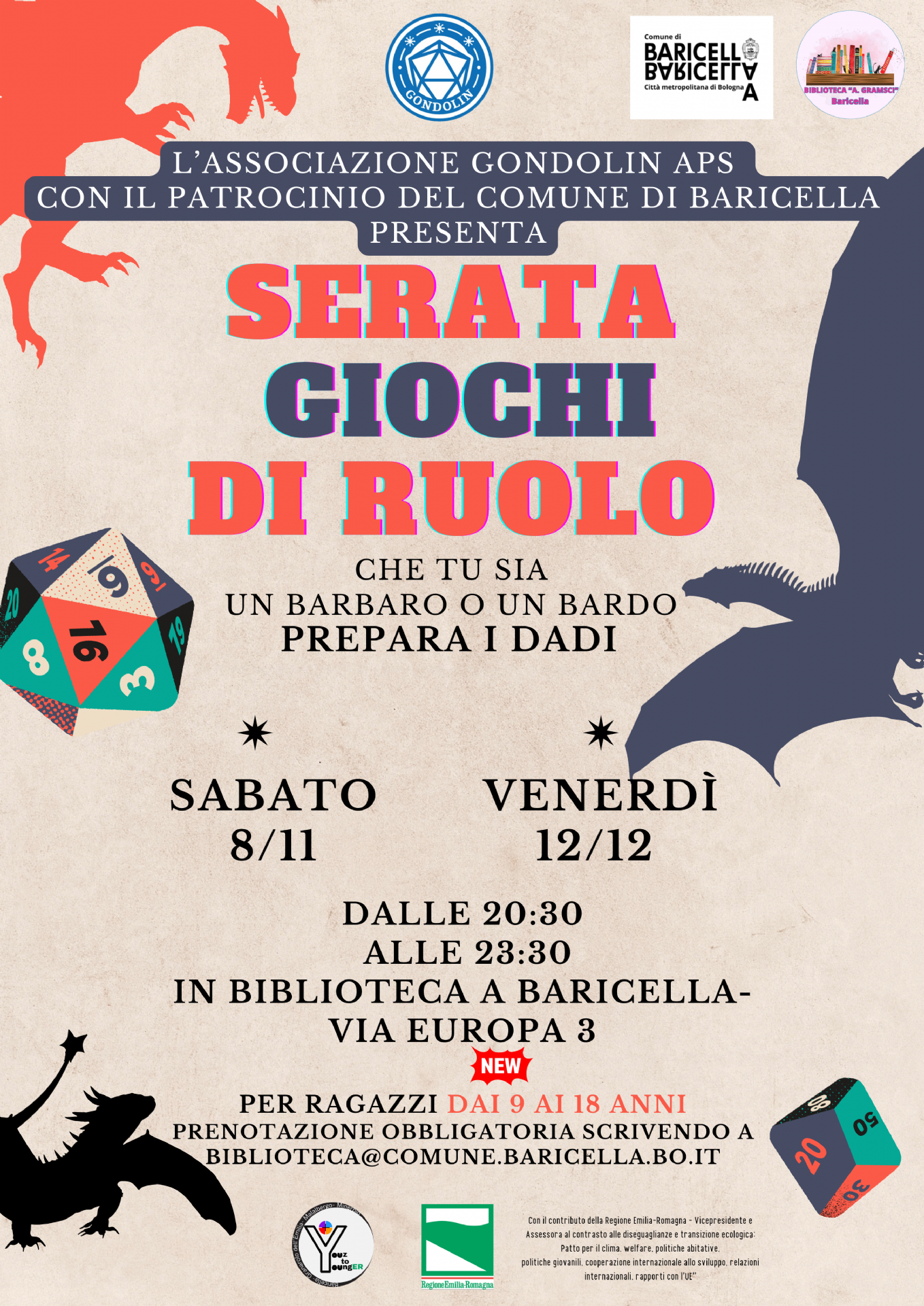 Due appuntamenti speciali a cura dell’associazione Gondolin APS, con il patrocinio del Comune di Baricella, sabato 8 novembre e venerdì 12 dicembre dalle 20:30 alle 23:30, pensati per i ragazzi dai 9 anni in su vedranno protagonista il mondo dei giochi di ruolo: il pomeriggio e la serata saranno interamente dedicati alle avventure da vivere in squadra, tra dadi e immaginazione.