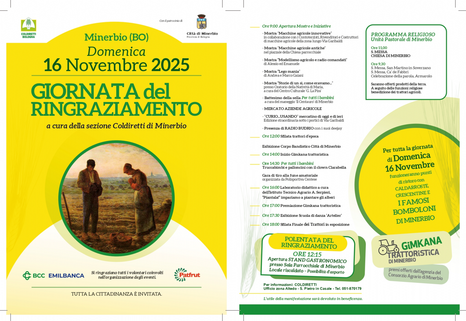 La Città di Minerbio, in collaborazione con la sezione Coldiretti di Minerbio, è lieta di ospitare la Giornata del Ringraziamento, che si terrà domenica 16 novembre 2025, con un ricco programma di eventi, celebrazioni e attività per grandi e piccini.
