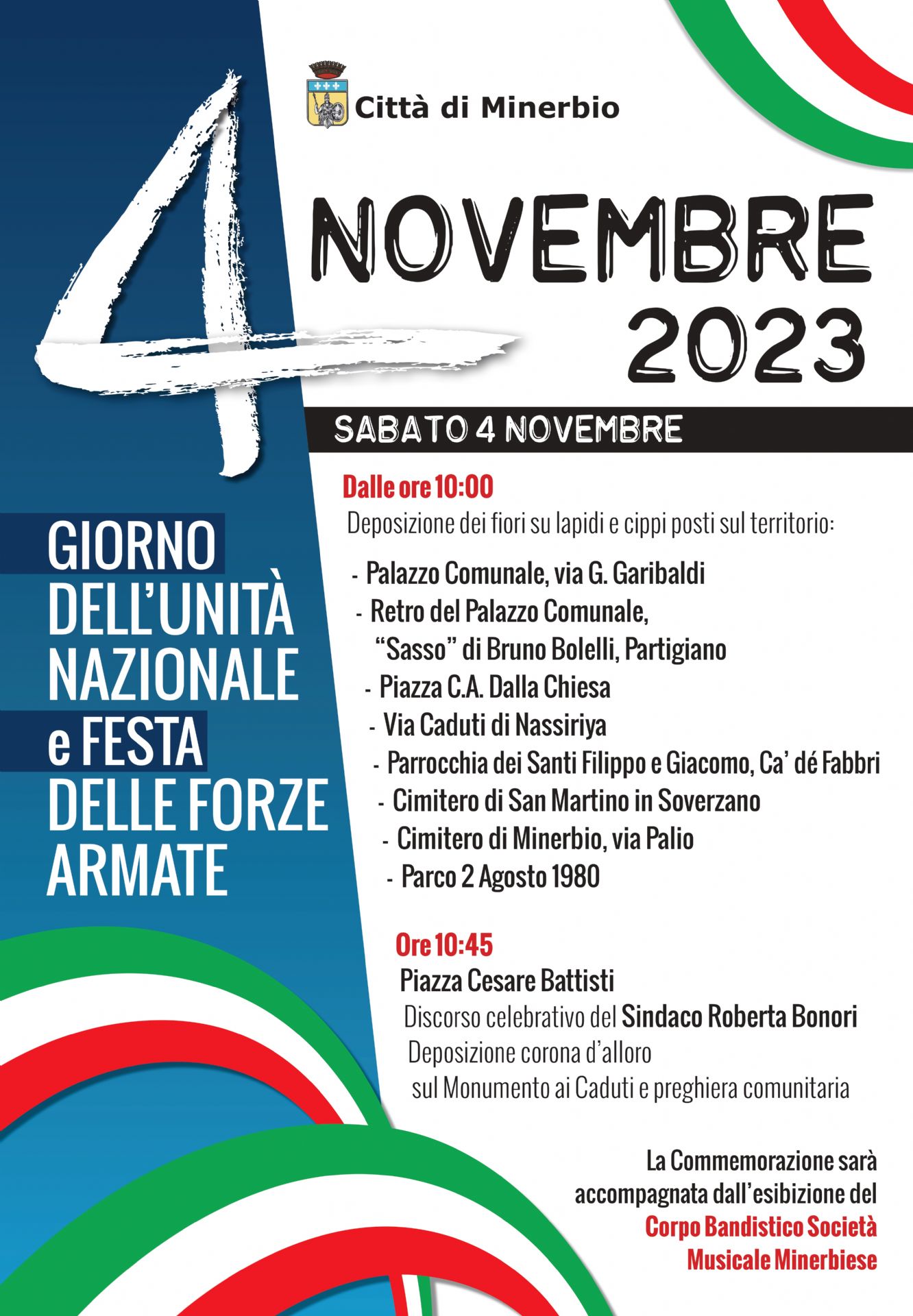 Il Giorno dell'Unità Nazionale e Festa delle Forze Armate 2023 sarà celebrato a Minerbio sabato 4 Novembre, con il seguente programma: