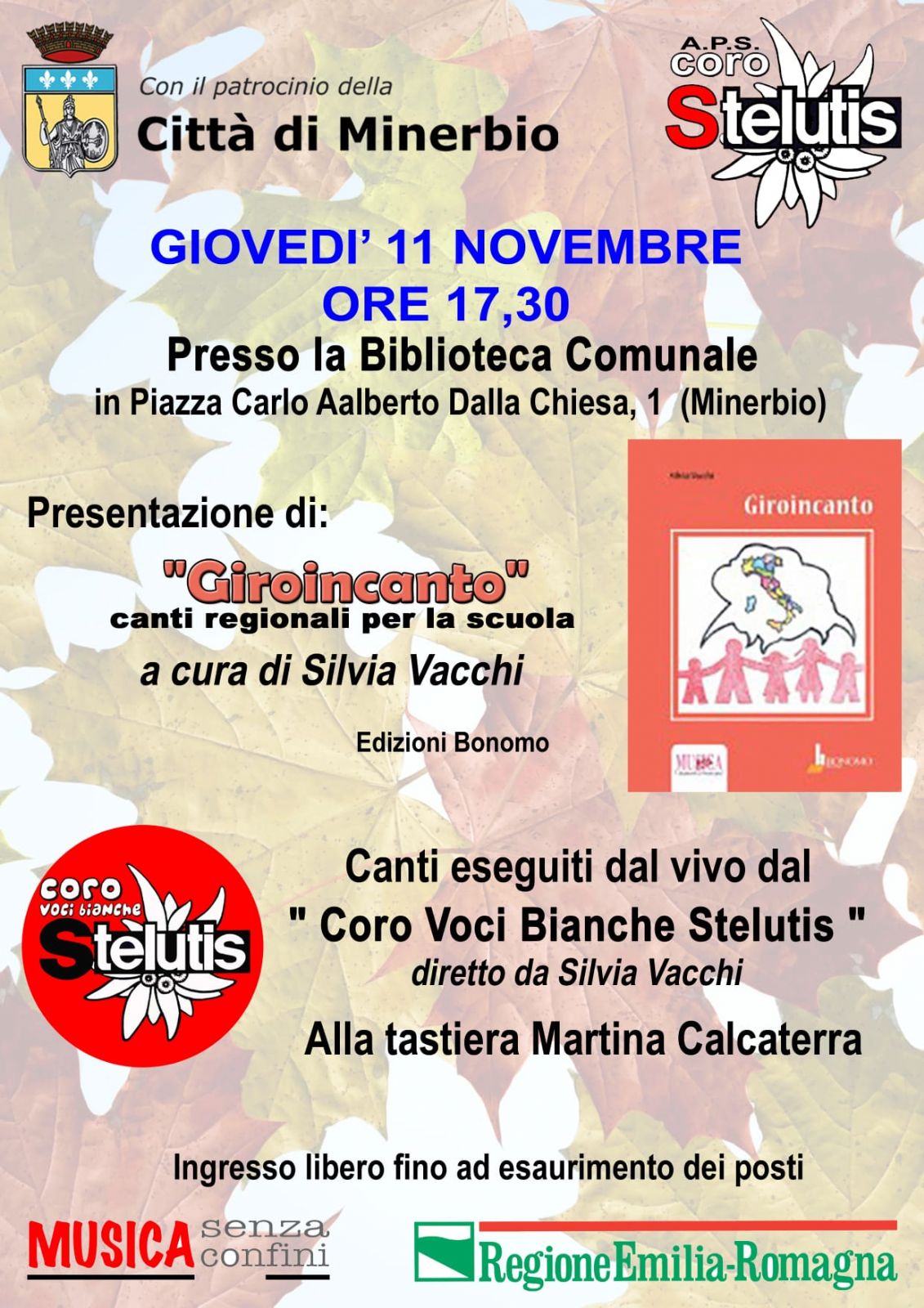 Giovedì 11 Novembre alle ore 17.30, presso la Biblioteca comunale Prometeo, Presentazione di "Giroincanto", canti regionali per la Scuola a cura di Silvia Vacchi.