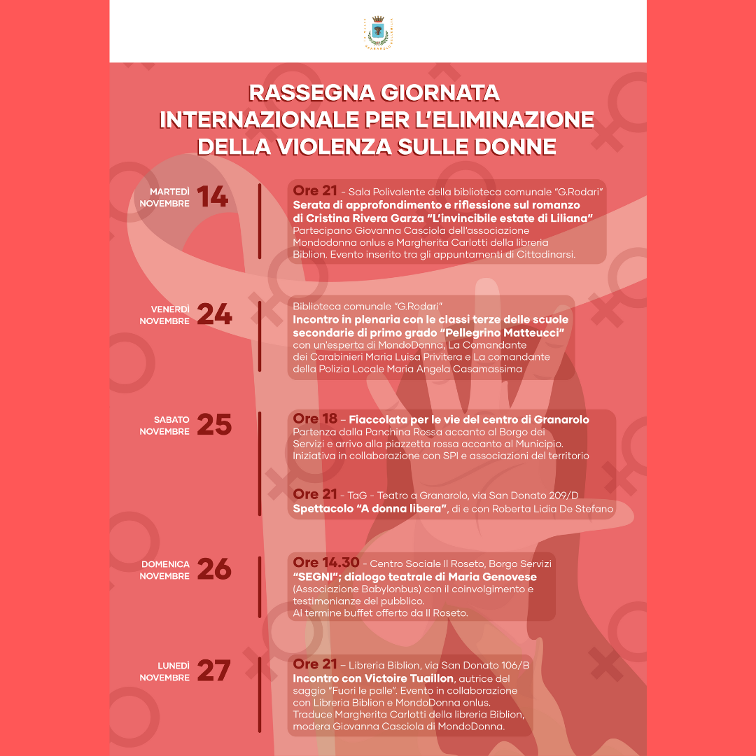 Dal 14 al 27 novembre Granarolo dell’Emilia dedica numerosi eventi, organizzati dall’Amministrazione comunale o con il suo patrocinio, in occasione della Giornata Internazionale per l’eliminazione della violenza sulle donne.