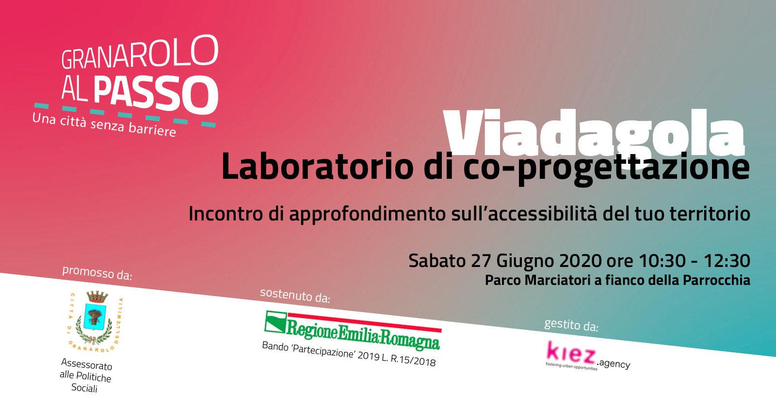 Ricordiamo che il percorso di partecipazione #granaroloalpasso promosso dal Comune di Granarolo dell'Emilia sta entrando nella fase di approfondimento: durante il mese di giugno 2020 sono stati organizzati 5 laboratori distinti, uno per frazione, all’interno dei quali abitanti della zona, associazioni e chiunque voglia partecipare, potranno confrontarsi tra loro e con i tecnici del comune sui temi dell’accessibilità.