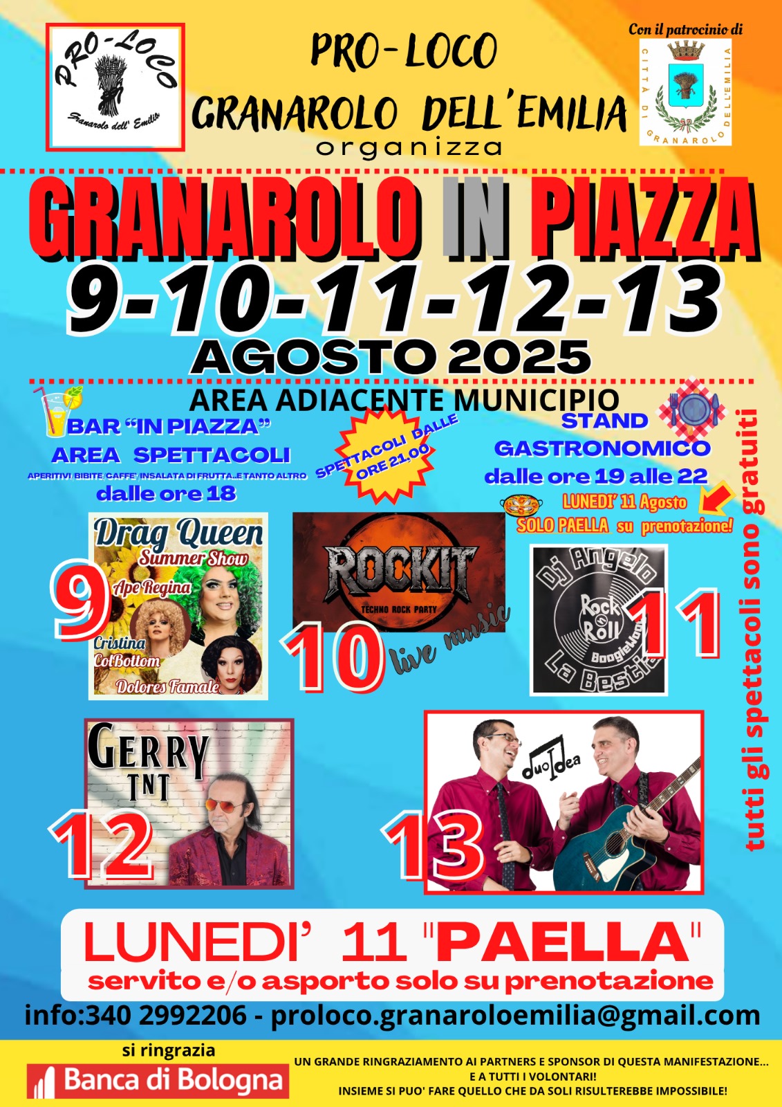 - Martedì 12 agosto: spazio ai balli di Granarolo in Piazza 2025: cinque serate di gusto, musica e divertimento