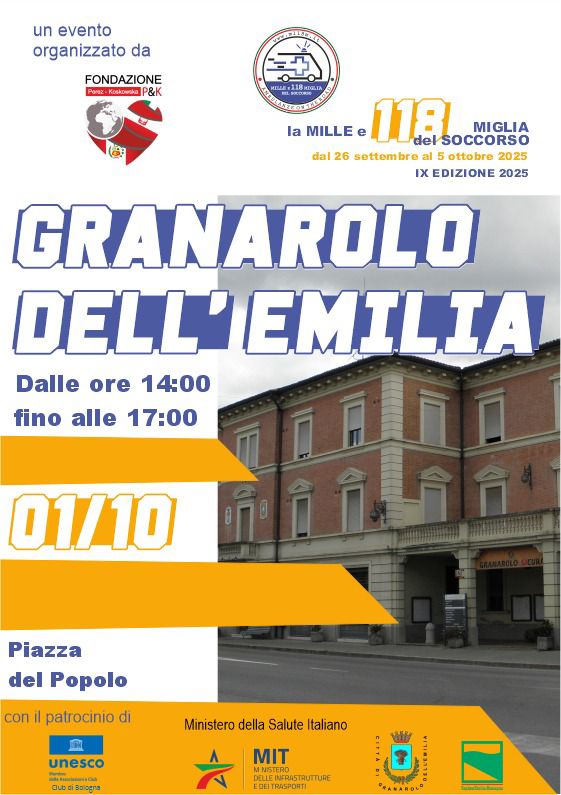 L’iniziativa gode del patrocinio del Ministero della Salute Italiano, del MIT (Ministero delle Infrastrutture e dei Trasporti), del Comune di Granarolo dell’Emilia, e dell’UNESCO Club di Bologna.