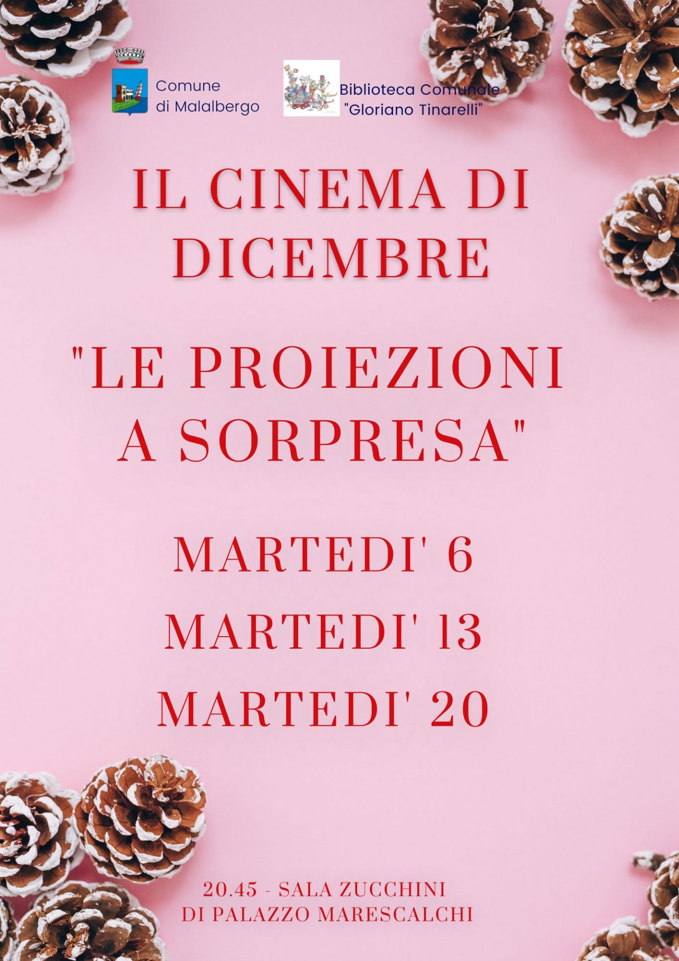 Il calendario delle "proiezioni a sorpresa" dei martedì di dicembre in Sala Zucchini a Palazzo Marescalchi.
