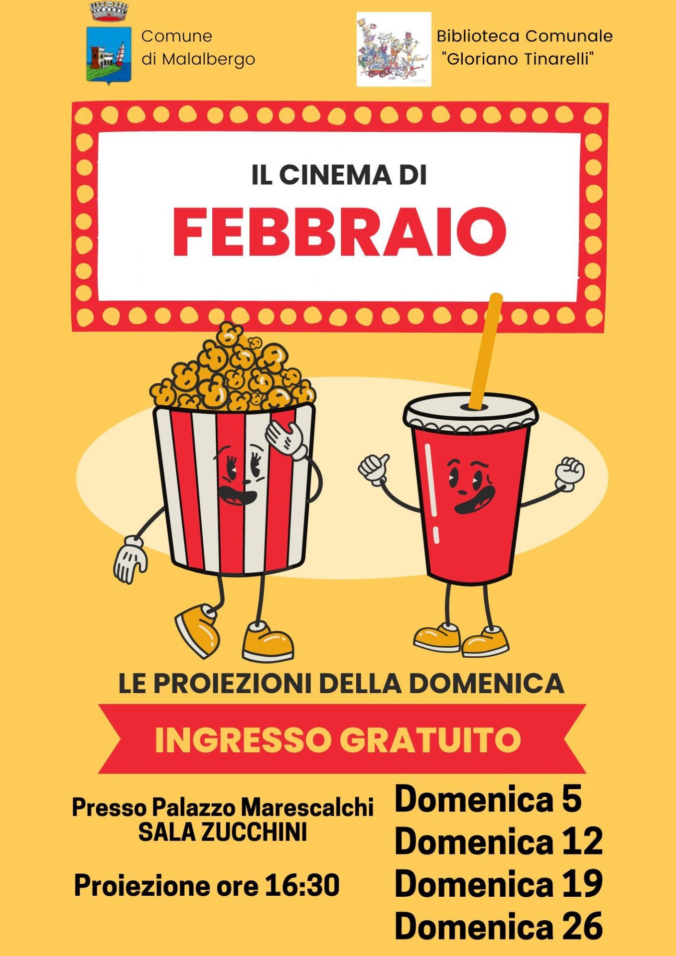 Il calendario delle "proiezioni a sorpresa" delle domeniche di Febbraio in Sala Zucchini a Palazzo Marescalchi.