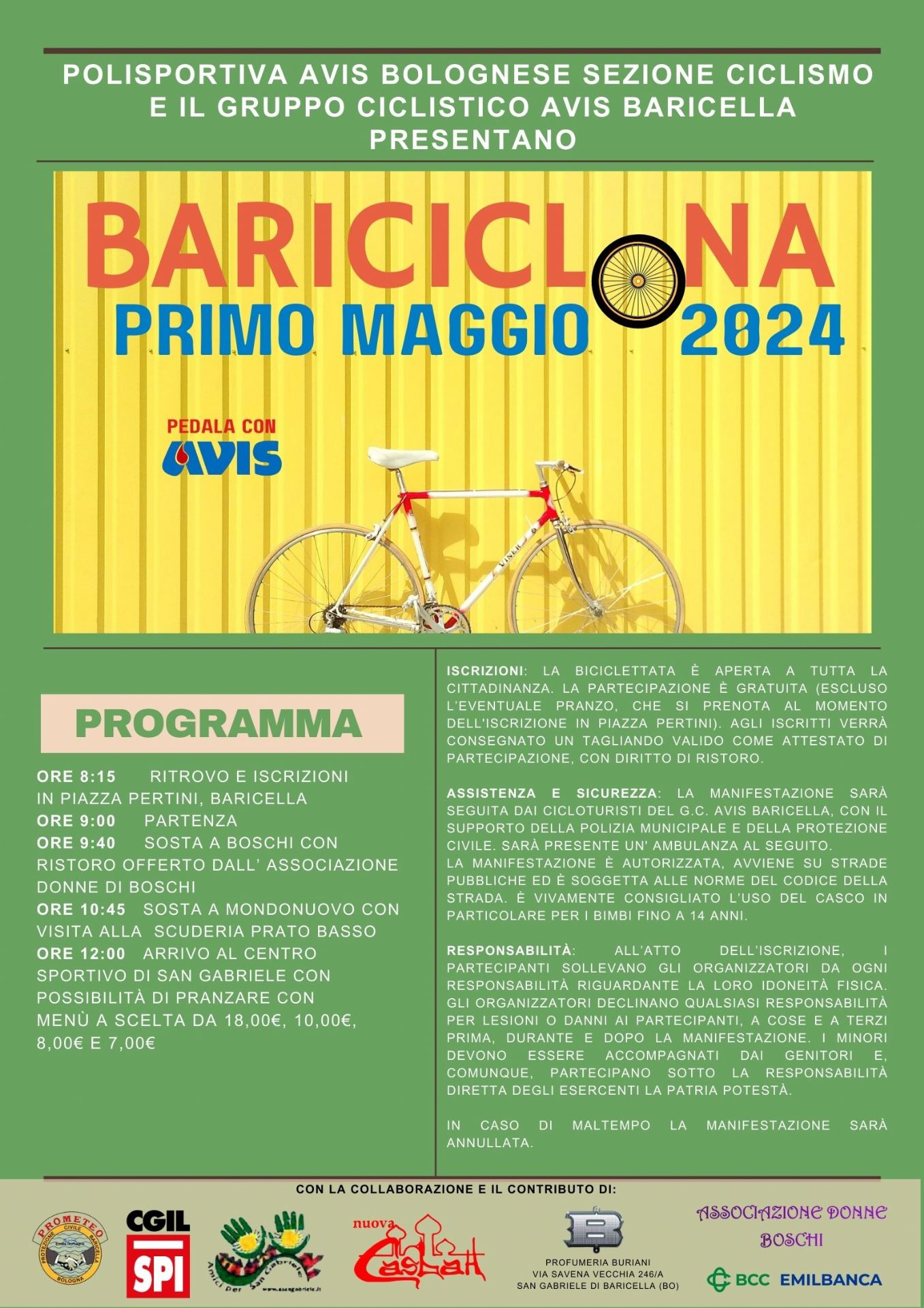Torna anche quest'anno Bariciclona, la tradizionale pedalata del Primo Maggio di Baricella organizzata dal Gruppo territoriale Baricella della Polisportiva Avis Bolognese, sezione ciclismo.