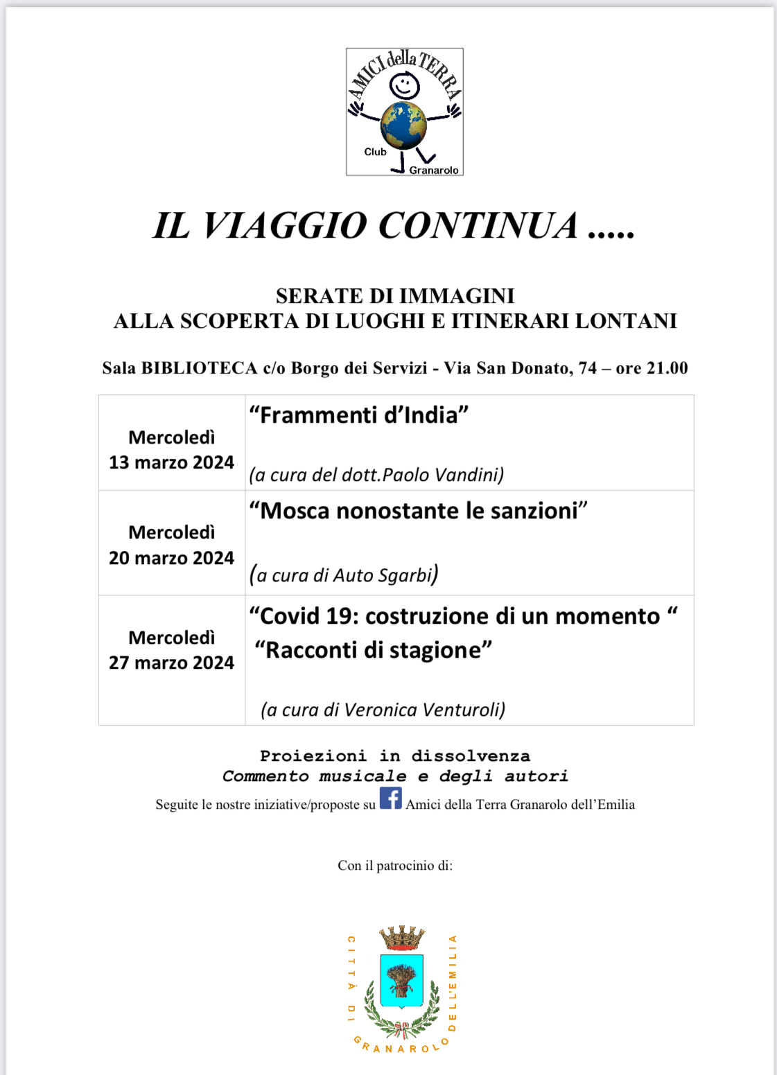 Prosegue nel mese di marzo 2024 il ciclo di proiezioni di fotografie di viaggio "Alla scoperta di luoghi e itinerari lontani", organizzato dagli Amici della Terra con il patrocinio del Comune di Granarolo dell'Emilia. Altre tre serate di proiezioni di fotografie in dissolvenza, con commento musicale e degli autori, che ci porteranno in India, a Mosca e a ricordare i giorni difficili del Covid 19.