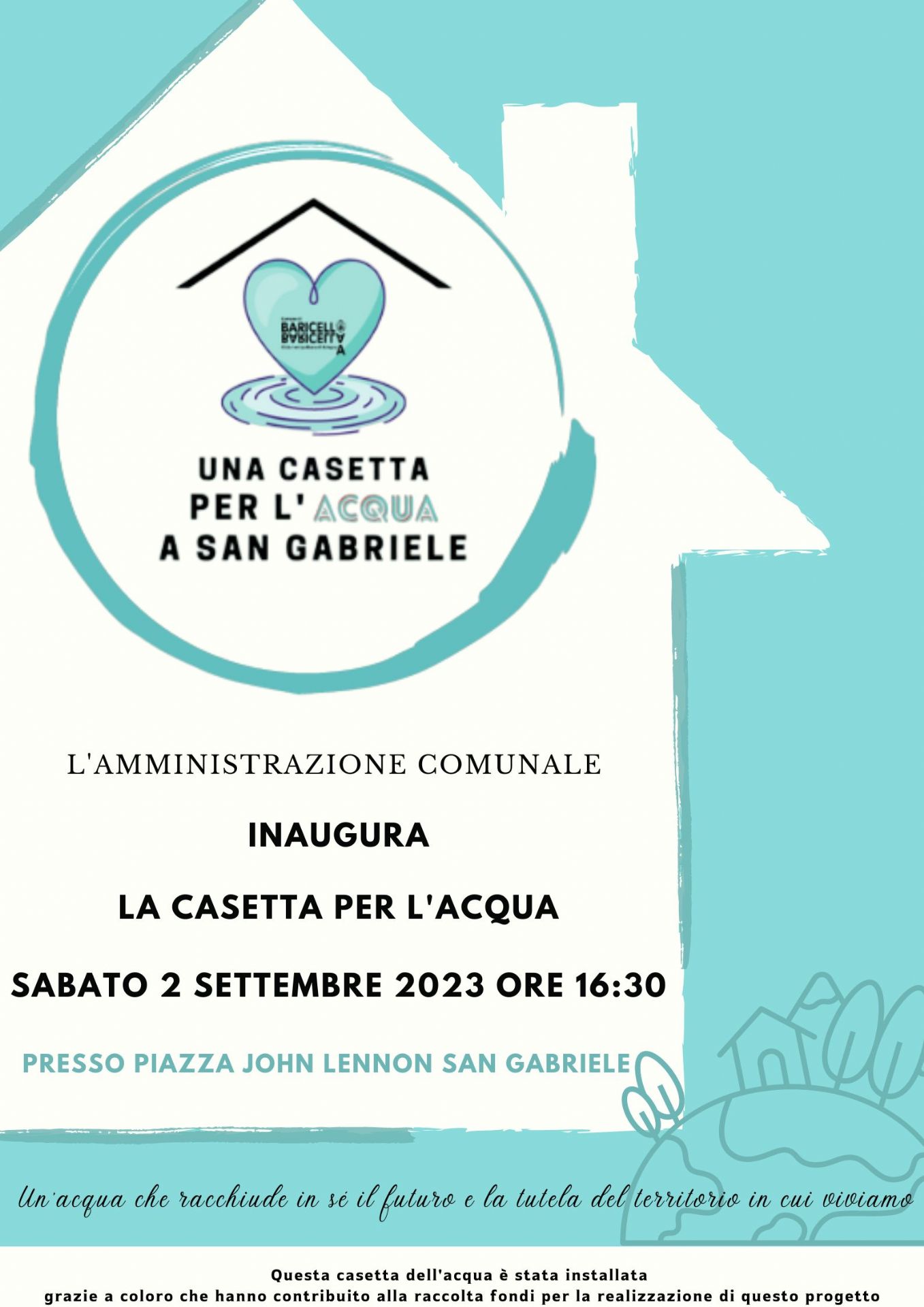 Sabato 2 Settembre 2023 alle ore 16.30 a San Gabriele presso piazza John Lennon si terrà l’inaugurazione della “Casetta per l’acqua”.