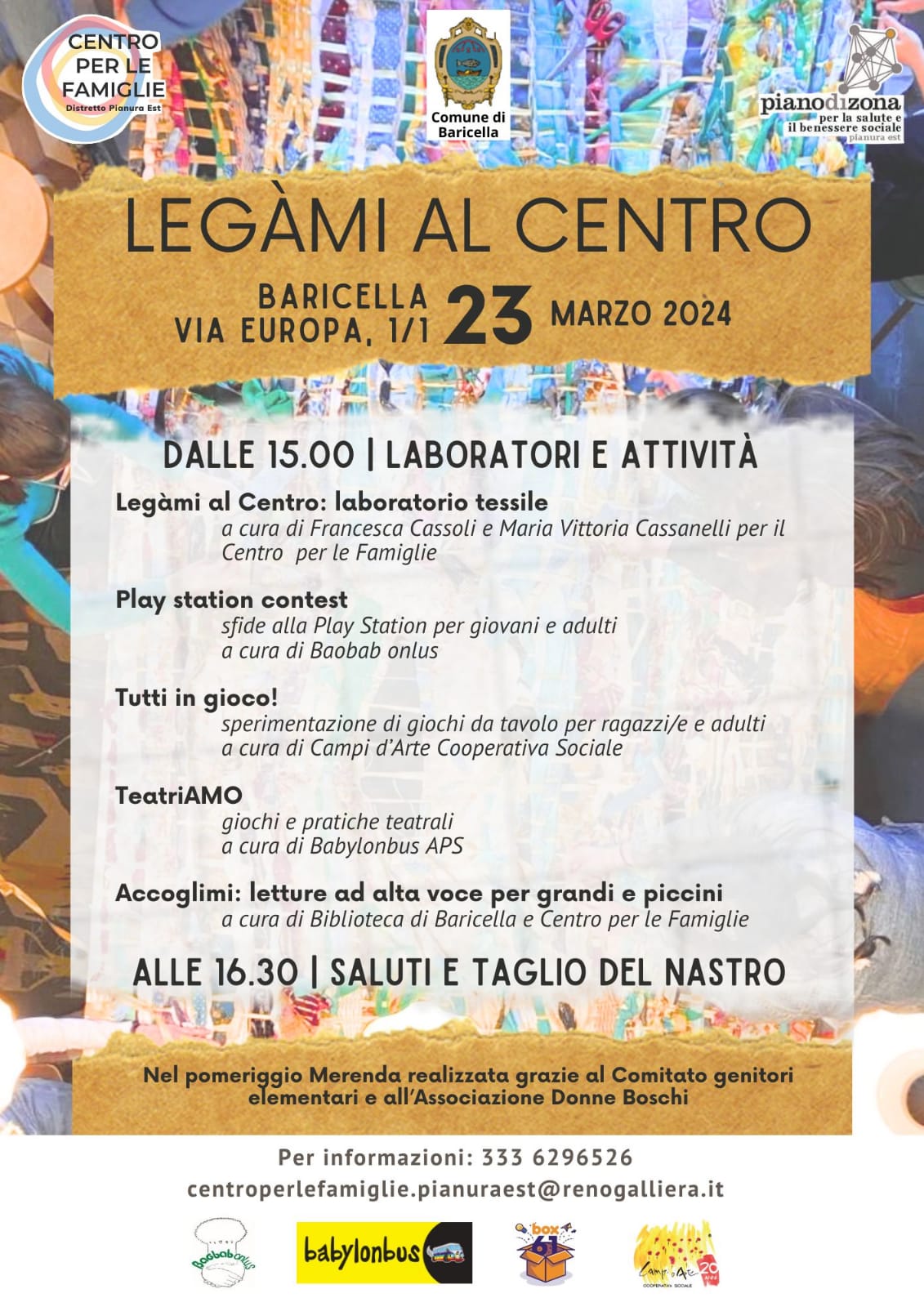 Il Centro per le famiglie è un servizio distrettuale, promosso e sostenuto dalla Regione Emilia-Romagna e si rivolge alle famiglie dei Comuni di Argelato, Baricella, Bentivoglio, Budrio, Castel Maggiore, Castello D'Argile, Castenaso, Galliera, Granarolo dell'Emilia, Malalbergo, Minerbio, Molinella, Pieve di Cento, San Giorgio di Piano, San Pietro in Casale.