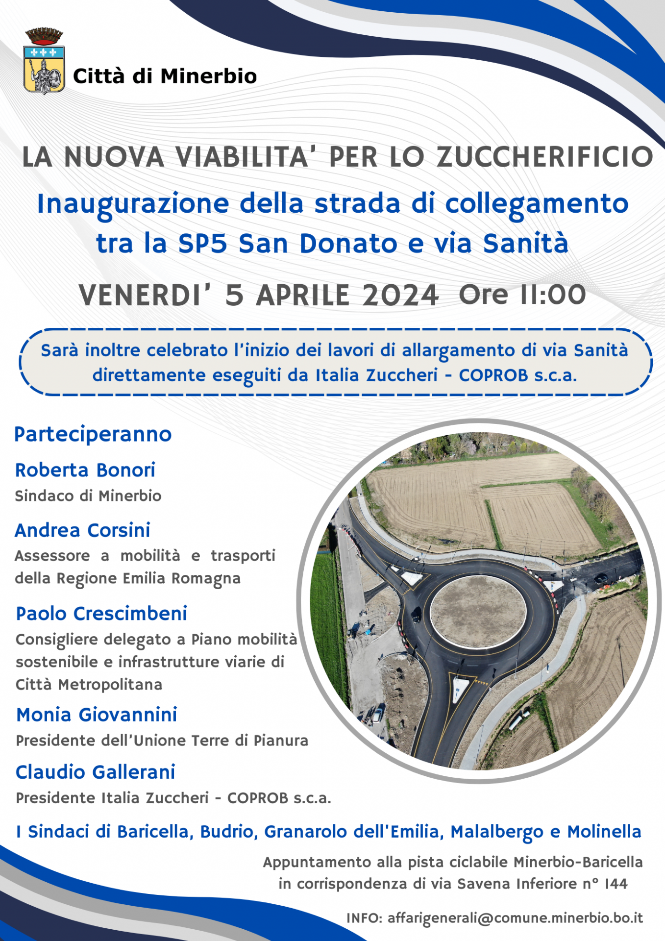 Venerdì 5 aprile 2024 alle ore 11.00 si terrà l'inaugurazione della strada di collegamento tra SP5 San Donato e via Sanità per la nuova viabilità per lo zuccherificio.