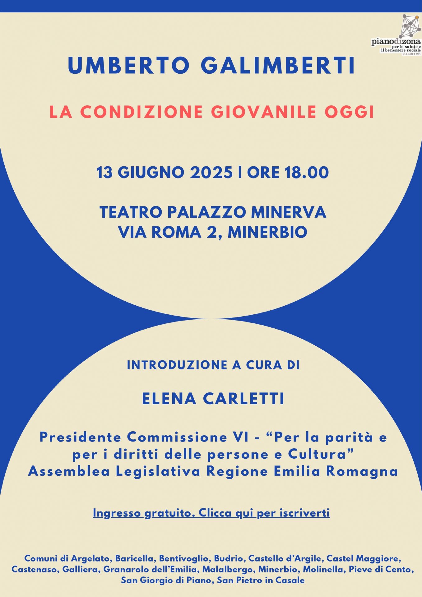 Venerdì 13 giugno 2025, alle ore 18.00, si tiene nel Teatro Palazzo Minerva di Minerbio (via Roma 2), un incontro pubblico con il professor Umberto Galimberti "La condizione giovanile oggi".