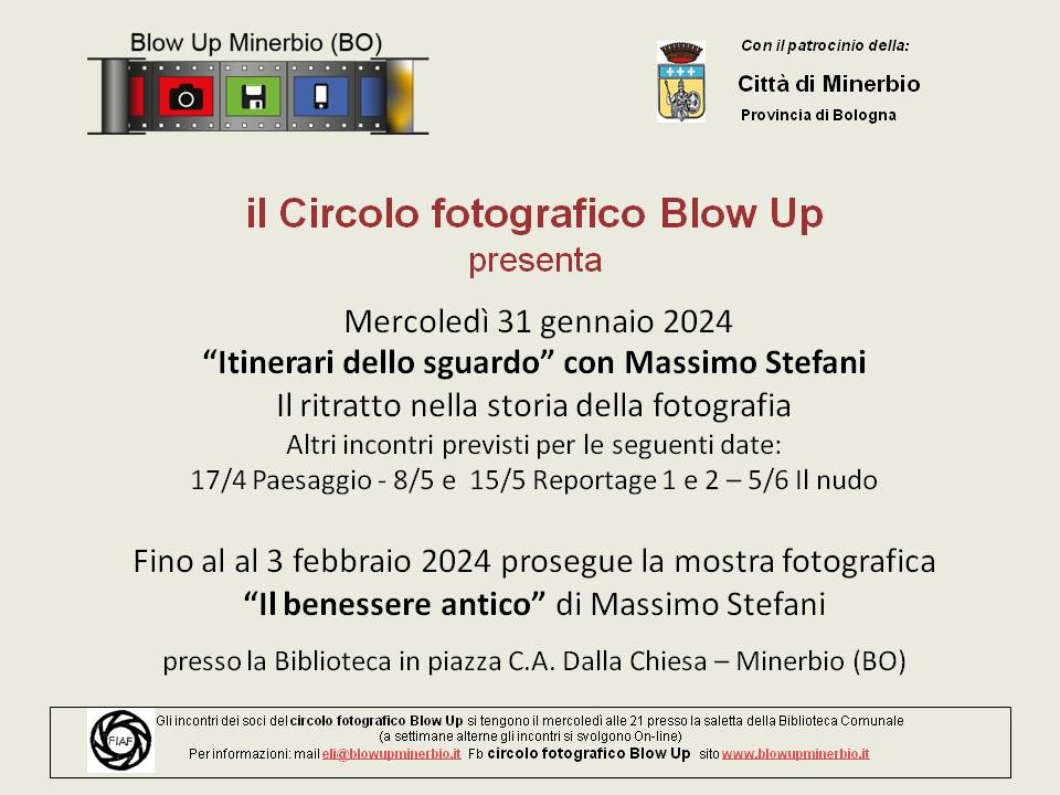 Il circolo fotografico Blow up presenta mercoledì 31 gennaio 2024 alle ore 21.00 presso la saletta multimediale della Biblioteca comunale in Piazza C.A. Dalla Chiesa a Minerbio il primo incontro del ciclo "Itinerari nello sguardo: storia della fotografia" con Massimo Stefani dal tema: Il ritratto nella storia della fotografia.