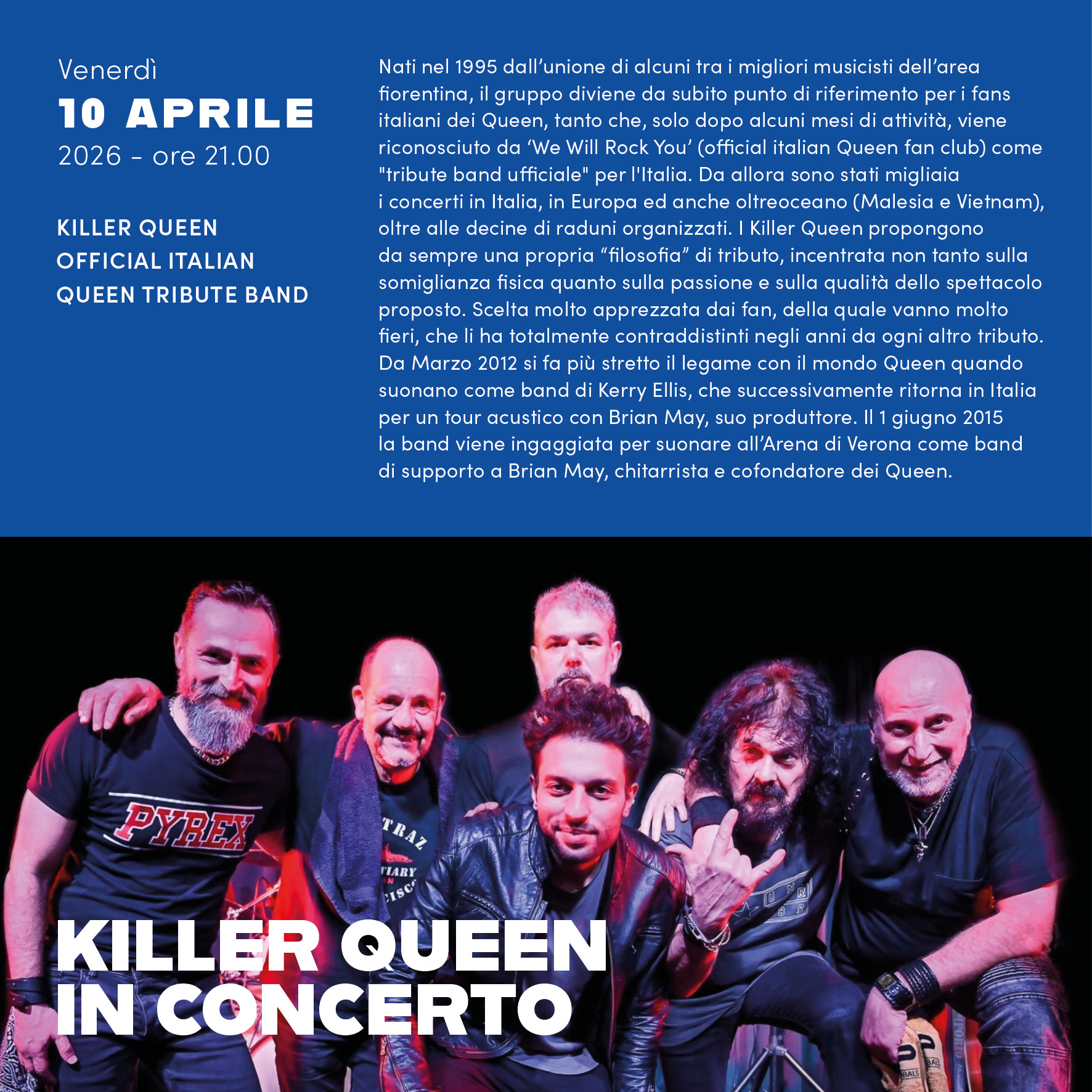 Venerdì 10 Aprile 2026 alle ore 21.00 si terrà a Palazzo Minerva lo spettacolo "Killer Queen in concerto, all'interno della stagione teatrale 2025/2026 di Palazzo Minerva.