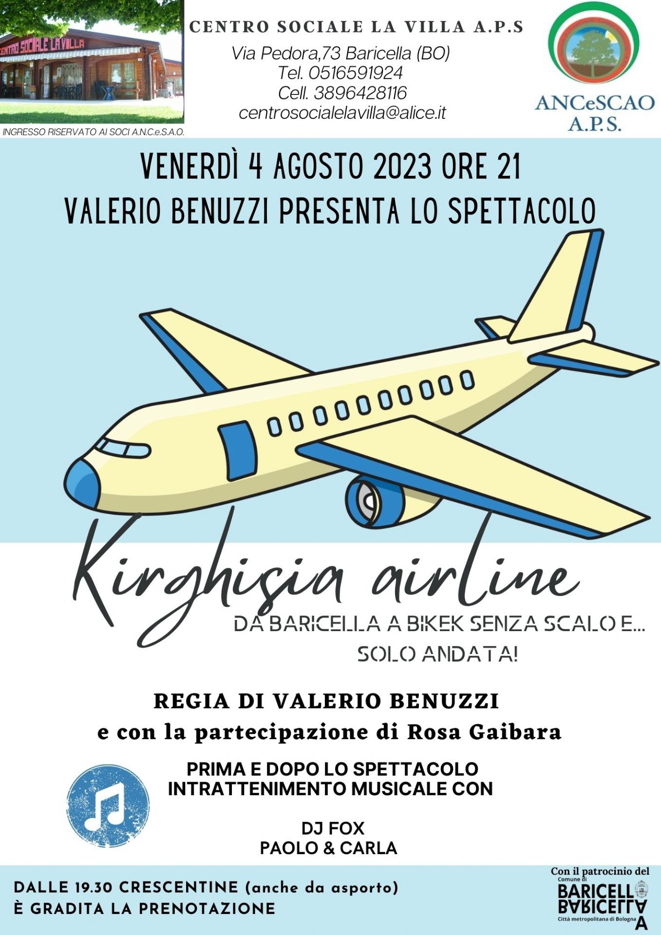 Con il patrocinio del comune di Baricella Venerdì 4 Agosto 2023 alle ore 21:00 si terrà lo spettacolo teatrale Kirghisia Airline di Valerio Benuzzi presso il Centro Sociale La Villa .