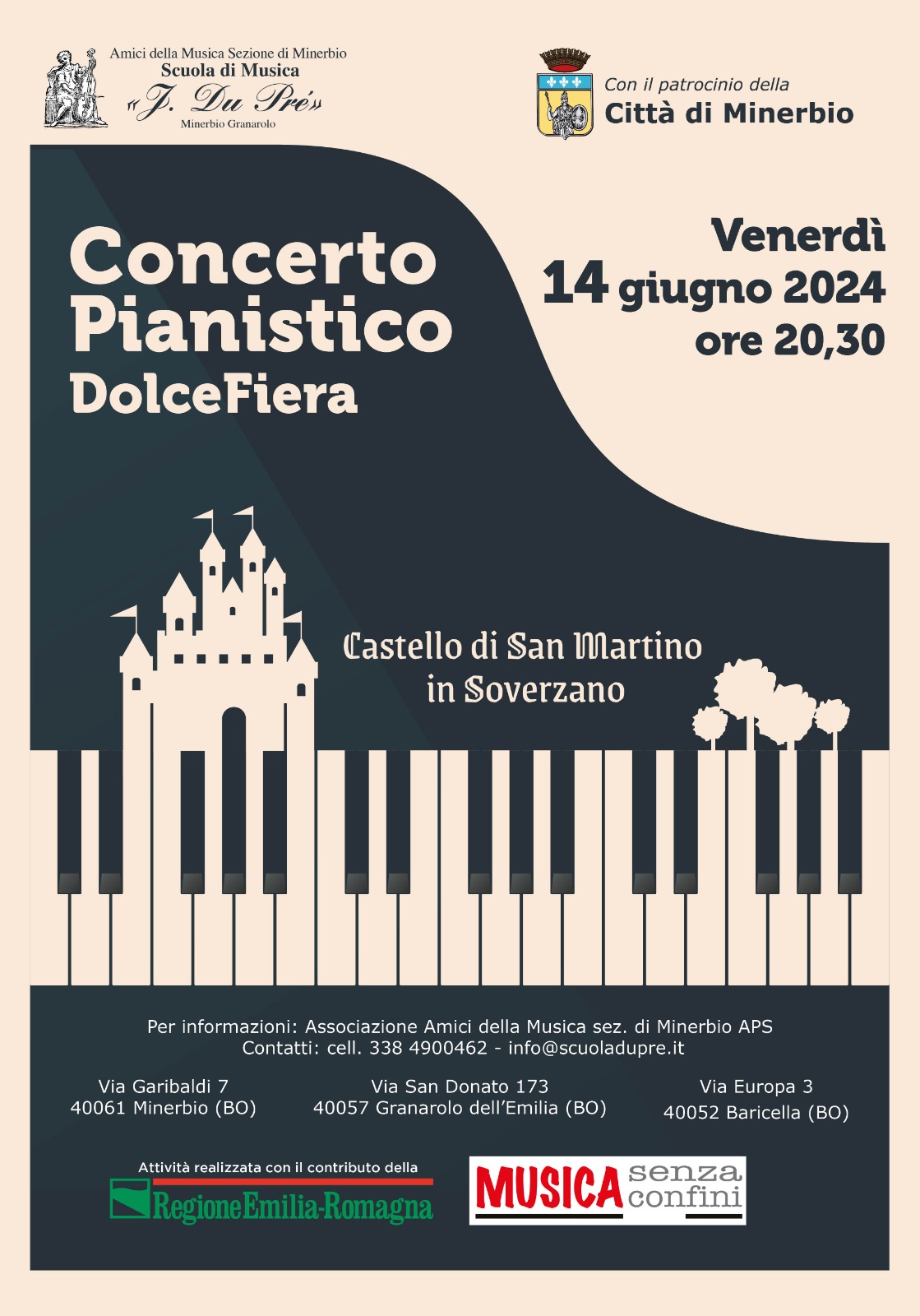 In occasione de LA DOLCE FIERA 2024, venerdì 14 giugno alle ore 21.00 presso il Castello dei Manzoli a San Martino in Soverzano, si terrà il tradizionale CONCERTO PIANISTICO a cura dell'associazione Amici della Musica sezione di Minerbio - Scuola di Musica J. Du Pré.